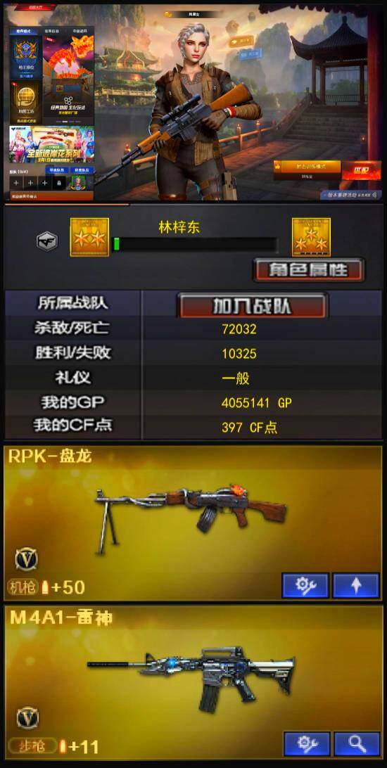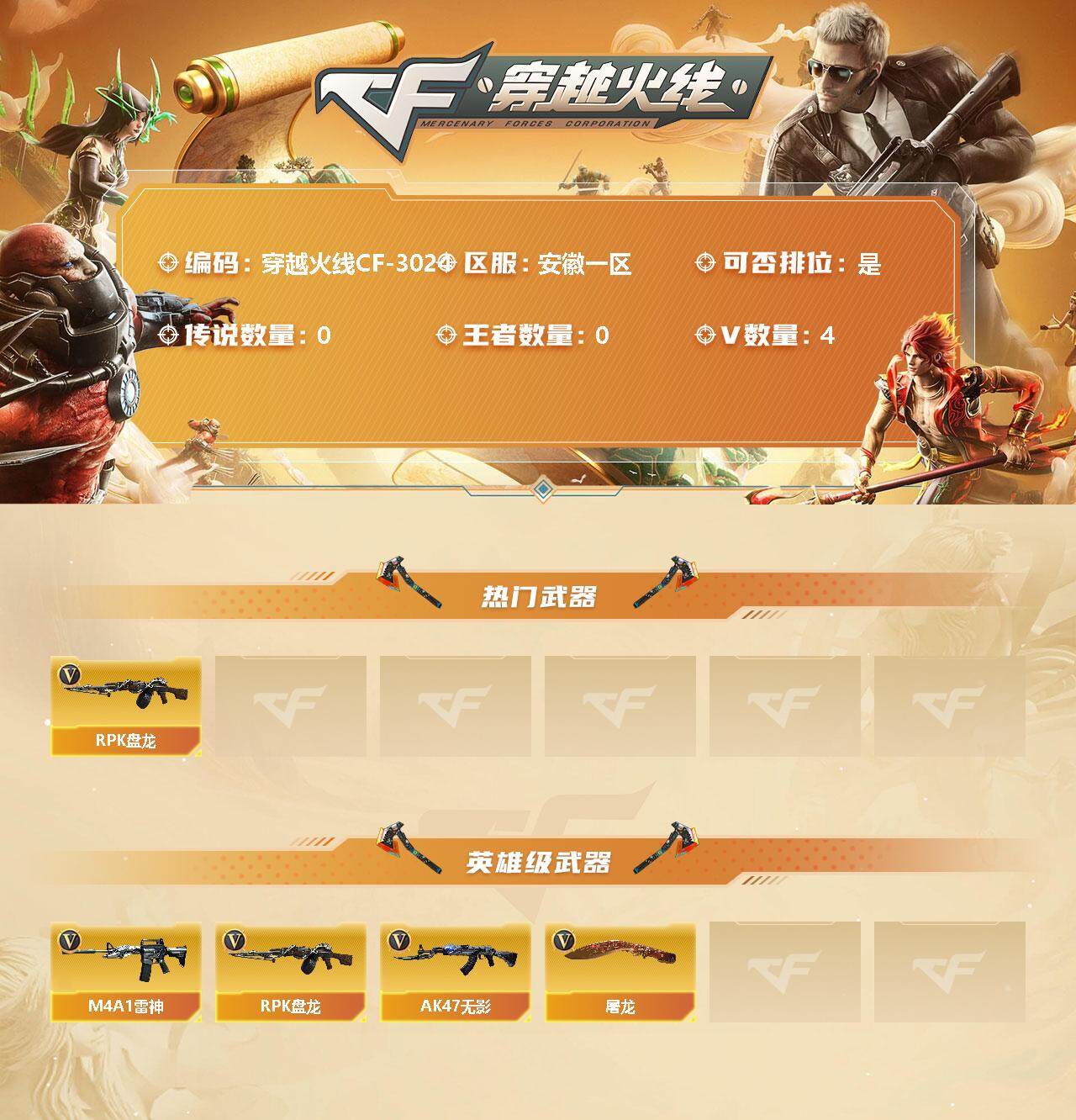 [12939174]安徽一区-4V-0王者-0炫金 【热门武器】:RPK-盘龙 【英雄级武器】:M4A1-雷神,AK47-无影,RPK-盘龙,屠龙 【特殊枪械】:1盘龙