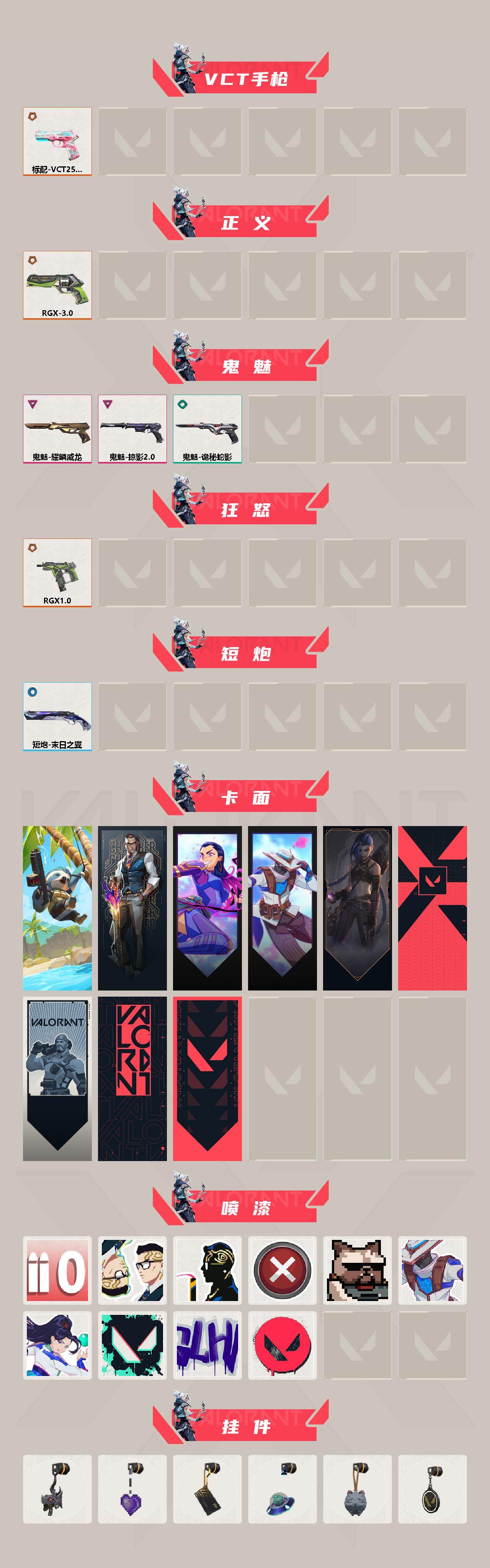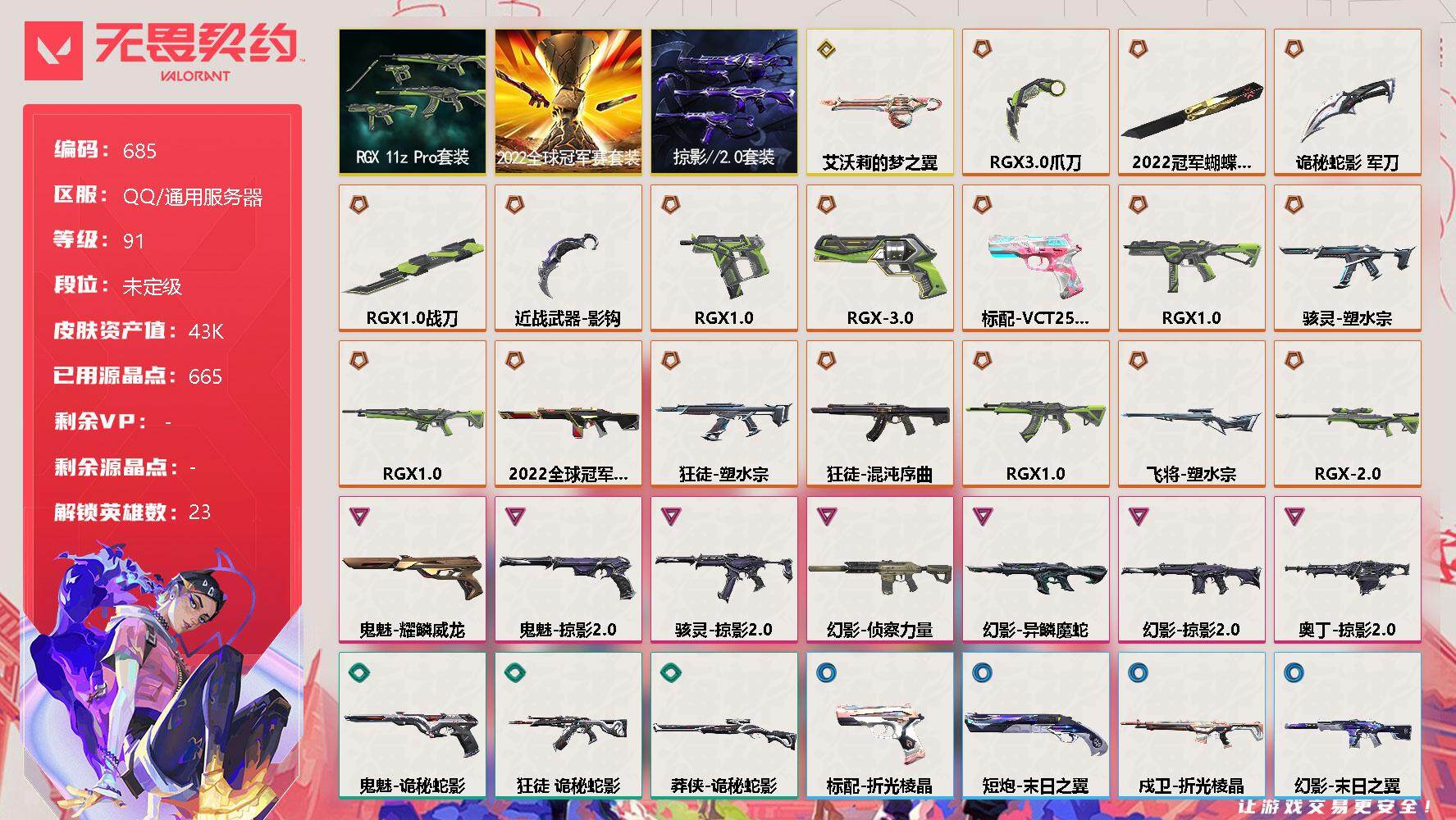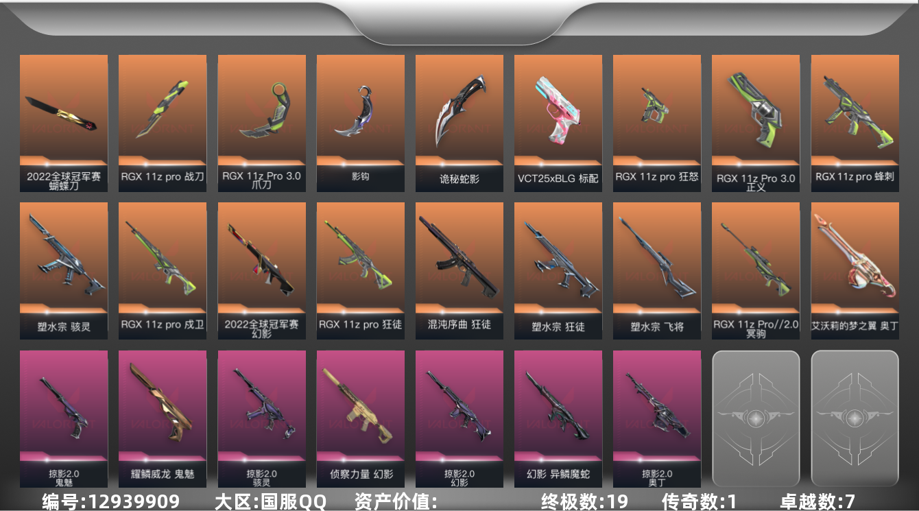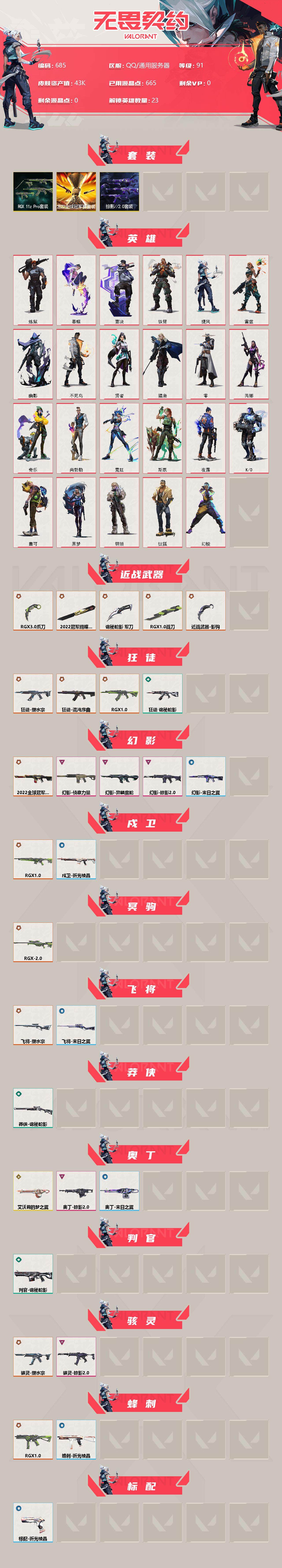 [12939909]【套装】:2022全球冠军赛套装,RGX 11z Pro套装,掠影//2.0套装 【英雄】:幻棱,炼狱,暮蝶,钛狐,壹决,铁臂,捷风,雷兹,幽影,不死鸟,贤者,猎枭,零,芮娜,奇乐,尚勃勒,霓虹,斯凯,夜露,K/O,盖可,黑梦,钢锁 【近战 武器】:近战武器-2022全球冠军赛 蝴蝶刀,近战武器-影钩,近战武器-RGX 11z Pro 战刀,近战武器-RGX 11z Pro//3.0 爪刀,近战武器-诡秘蛇影 军刀 【狂徒】:狂徒-混沌序曲,狂徒-塑水宗,狂徒-RGX 11z Pro,狂徒-诡秘蛇影 【幻影】:幻影-2022全球冠军赛,幻影-侦察力量,幻影-异鳞魔蛇,幻影-掠影//2.0,幻影-末日之翼 【戍卫】:戍卫-RGX 11z Pro,戍卫-折光棱晶 【冥驹】:冥驹-RGX 11z Pro//2.0 【飞将】:飞将-塑水宗,飞将-末日之翼 【莽侠】:莽侠-诡秘蛇影 【奥丁】:奥丁-艾沃莉的梦之翼,奥丁-掠影//2.0,奥丁-末日之翼 【判官】:判官-诡秘蛇影 【骇灵】:骇灵-塑水宗,骇灵-掠影//2.0 【蜂刺】:蜂刺-RGX 11z Pro,蜂刺-折光棱晶 【标配】:标配-折光棱晶 【VCT手枪】:标配-VCT25 x BLG 【正义】:正义-RGX 11z Pro//3.0 【鬼魅】:鬼魅-耀鳞威龙,鬼魅-掠影//2.0,鬼魅-诡秘蛇影 【狂怒】:狂怒-RGX 11z Pro 【短炮】:短炮-末日之翼 【卡面】:树懒大作战 卡面,无畏契约:尚勃勒 卡面,无畏契约GO!第一卷:芮娜 卡面,无畏契约GO!第一卷:零 卡面,《双城之战》金克丝 卡面,代号红色 卡面,新兵报到 卡面,V契约 卡面,无畏契约 卡面 【喷漆】:拼一枪 喷漆,分身有术 喷漆,致命优雅 喷漆,买装还是存钱 喷漆,关门放狗 喷漆,无畏契约GO!第一卷:零 喷漆,无畏契约GO!第一卷:贤者 喷漆,胜利属于无畏契约 喷漆,GLHF 喷漆,无畏契约 喷漆 【挂饰】:鱼骨头 挂饰,薰衣草之心 挂饰,有事联系 挂饰,天外飞客 挂饰,《双城之战》魄罗 挂饰,无畏契约 纪念币 挂饰