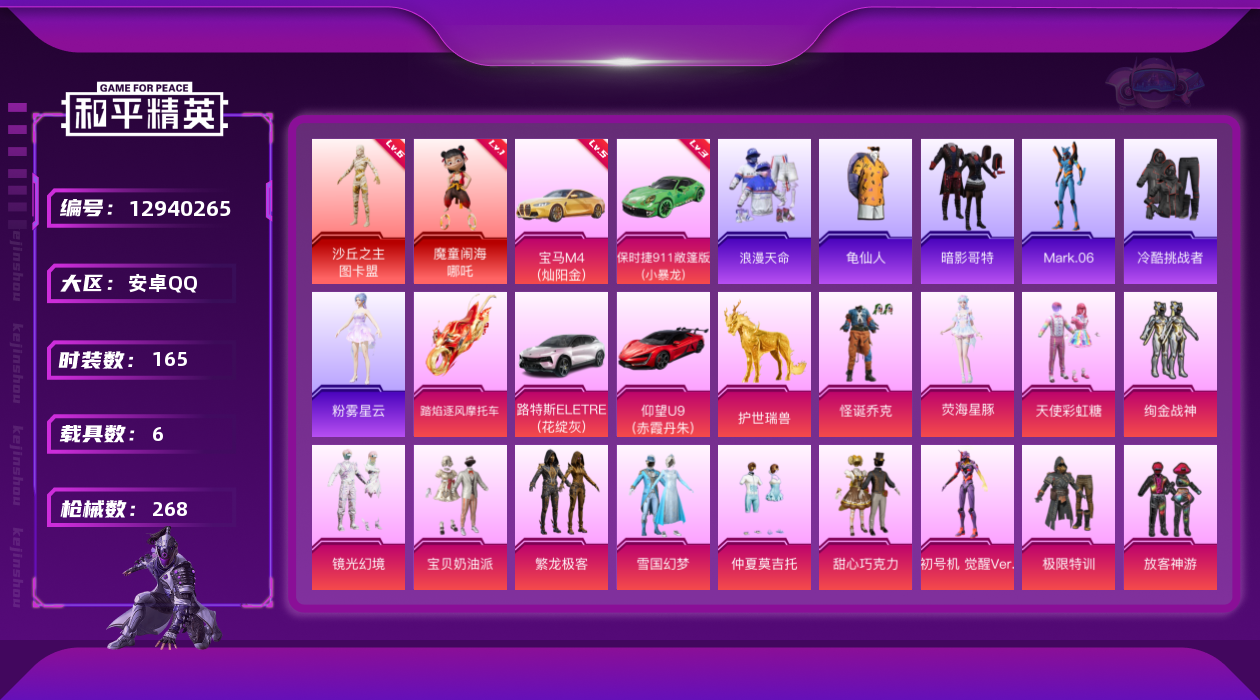 - [13081065]河南一区-47V-2王者-0炫金 【热门武器】:QBZ03-金色蔷薇,M200-竞技荣光,白虎-电玩蓝兔,USP-雷暴,沙鹰-修罗 【音效卡】:擎天-云海游龙音效卡,Barrett-碧霄极光音效卡 【皮肤】:裁决-运输船 皮肤,雷神-宇航兔皮肤,战神-紫绶金章皮肤,战神-流金岁月皮肤 【角色】:电竞教官-云悠悠,云海玲珑,王者葵-惊若翩鸿,零-水下丽影,蜀雪,铁骑荣耀,青霞仙子 【人偶武器】:火麒麟-灵狐,AWM-灵狐-15周年嘉年华,COP-旗袍,迷你超能女侍,迷你深渊冰龙,迷你裂空之翼*2,迷你波特博士*2,迷你牛牛,灵狐娃娃手雷,生化手雷-机甲核心,深渊终结者手雷 【暴走生化】:超级对讲机 【挑战大师】:神圣爆裂者III,冰龙粉碎者-白马银枪,VEPR-12-金魔,激光毁灭者III,试炼破坏者III 【英雄级武器】:AK47-火麒麟,M4A1-雷神,无影-神兵利器,黑武士-锦绣游龙,超新星-热带奇洋,QBZ03-金色蔷薇,AK-47-猩红传说*2,白虎-电玩蓝兔,AWM-裁决,M200-竞技荣光,烈龙-云海游龙,沙鹰-修罗,USP-雷暴,柯尔特-竞技荣光,麒麟刺,擎天-竞技荣光*4,擎天-云海游龙,龙啸-热带奇洋,王者之锋-觉醒版,高爆手雷-竞技荣光*7,手雷-云海游龙,手雷-热带奇洋,高爆手雷-玄豹,闪光弹-竞技荣光*7,烟雾弹-竞技荣光*7,烟雾弹-玄豹 【特殊枪械】: