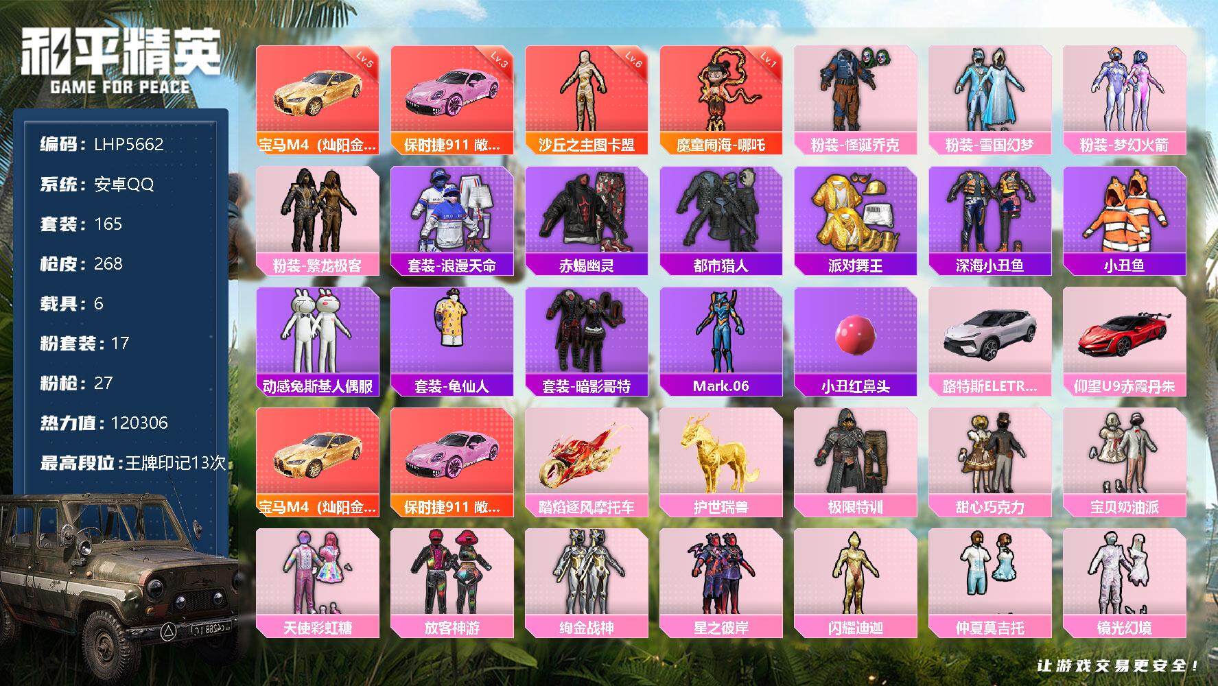 [12940265]素材身法号/绝世印记2/璀璨碎片989/沙丘之主-图卡盟(六级)/宝马M4(灿阳金)(五级) 安卓 手Q-2神装-17粉装-27特效枪-6载具-16粉色飞行器-12w热力值-13王牌印记-165套装-268枪皮【红色载具】:宝马M4(灿阳金)(五级),保时捷911 敞篷版(小暴龙)(三级)【红色神装等级】:魔童闹海-哪吒(一级),沙丘之主-图卡盟(六级)【热门品类】:粉装-怪诞乔克,粉装-雪国幻梦,粉装-梦幻火箭,粉装-繁龙极客,套装-浪漫天命,套装-赤蝎幽灵,套装-都市猎人,套装-派对舞王,套装-深海小丑鱼,套装-小丑鱼,套装-动感兔斯基人偶服,套装-龟仙人,套装-暗影哥特,角色-Mark.06,小丑红鼻头【粉色载具】:路特斯ELETRE(花绽灰),仰望U9(赤霞丹朱),宝马M4(灿阳金),保时捷911 敞篷版(小暴龙),踏焰逐风摩托车,护世瑞兽【粉色套装】:粉装-极限特训,粉装-怪诞乔克,粉装-甜心巧克力,粉装-宝贝奶油派,粉装-天使彩虹糖,粉装-雪国幻梦,粉装-梦幻火箭,粉装-放客神游,粉装-绚金战神,粉装-星之彼岸,角色-闪耀迪迦,粉装-仲夏莫吉托,粉装-镜光幻境,粉装-繁龙极客,套装-创世·救赎,角色-初号机 觉醒Ver.,角色-荧海星豚【粉色枪皮等级】:AKM-绿萝繁花(五级),AKM-魔法神域(六级),SCAR-L-纯梦嫁纱(一级),SCAR-L-魔童闹海 哪吒(六级),M416-心之恋语(一级),M416-电玩时刻(三级),M416-灵猫魔法师(八级),GROZA-镜光银凌(五级),AUG-星之彼岸(五级),M762-甜蜜誓约(六级),蜜獾-荧海星豚(四级),UMP45-相思残雪(五级),UMP45-量子极限(五级),Vector-最终圣卫者(三级),汤姆逊-热量炸弹(五级),P90-沙丘之主(三级),Kar98K-创世·救赎(一级),Kar98K-巳巳如意(五级),M24-镜域双华(三级),Mk14-甜梦熊击(五级),DP-28-豹影疾电(五级),MG-36-沧焰双生(四级),撬棍-永恒法杖(二级),平底锅-仲夏莫吉托(二级),破片手榴弹-热量炸弹(一级),破片手榴弹-美味星星糖(五级)【粉色飞行器】:酣梦熊熊飞行器,梦幻火箭飞行器,星之彼岸飞行器,齐天大圣飞行器,千面幻镜飞行器,沙丘之主天马,繁龙极客飞行器,镜域双华-灵镜之阶,龙翔九天飞行器,