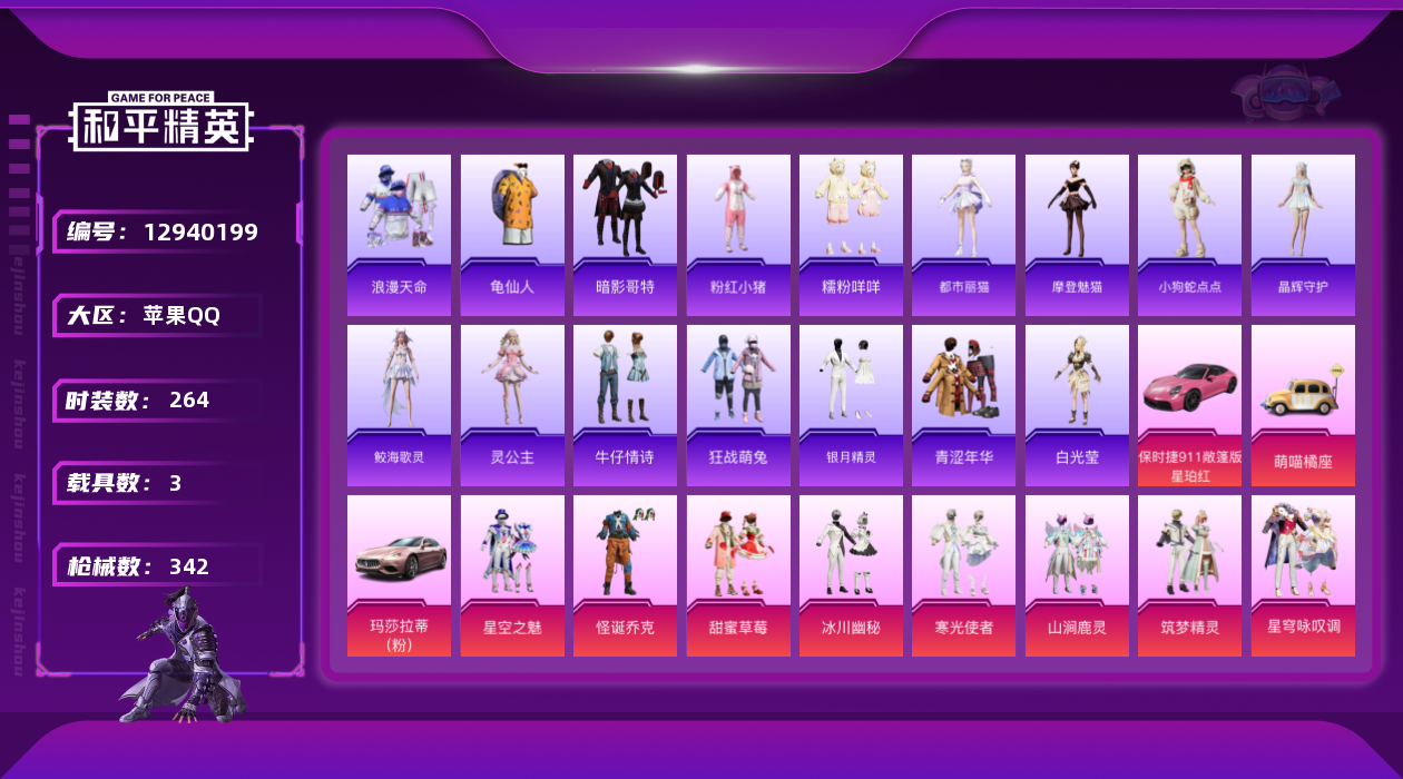 [12940199]素材身法号/无敌战神框1/绝世印记1 苹果 手Q-无敌战神框-36粉装-15特效枪-3载具-14粉色飞行器-12.7w热力值-18王牌印记-264套装-342枪皮【热门品类】:粉装-怪诞乔克,粉装-雪国幻梦,粉装-童趣迷兔,粉装-音爆索尼克,粉装-缤纷油彩,套装-浪漫天命,套装-都市猎人,套装-派对舞王,套装-小丑鱼,角色-军刀雅典娜,套装-胖达团团,套装-沙漠守护者,套装-动感兔斯基人偶服,套装-龟仙人,套装-潮萌小黄鸭,套装-暗影哥特,套装-粉红小猪,套装-糯粉咩咩,小丑红鼻头【粉色载具】:玛莎拉蒂Ghibli(粉),保时捷911 敞篷版(星珀红),萌喵橘座【粉色套装】:粉装-粉色回忆,粉装-怪诞乔克,粉装-甜心巧克力,粉装-宝贝奶油派,粉装-天使彩虹糖,粉装-雪国幻梦,粉装-缤纷油彩,粉装-放客神游,粉装-极致幻想,粉装-星空之魅,粉装-冰霜白皇,粉装-童趣迷兔,粉装-炙焰红王,粉装-彩虹鹿灵,粉装-山涧鹿灵,粉装-岚岚物语,粉装-恐龙拽拽,粉装-绚丽摇曳,粉装-筑梦精灵,粉装-甜梦小狐,粉装-暖熊萌萌,粉装-傲雪凌霜,粉装-垂柳戏鸭,粉装-彩虹甜喵,粉装-甜蜜草莓,粉装-冰川幽秘,粉装-霞光圣骑,粉装-寒光使者,粉装-音爆索尼克,粉装-未来歌姬,粉装-莲影清波,角色-烟云彩露,粉装-未来领航者,粉装-雪月幻音,粉装-星穹咏叹调,角色-绯穹魔姬【粉色枪皮等级】:AKM-梦之光华(五级),M16A4-垂柳戏鸭(五级),SCAR-L-青春物语(七级),SCAR-L-锦绣绵绵(五级),M416-心之恋语(七级),M416-灵猫魔法师(三级),AUG-暖羊咩咩(五级),ARX-无垠阁(五级),汤姆逊-热量炸弹(五级),Kar98K-巳巳如意(五级),AWM-橘柚倾心(五级),AMR-炫光之旅(六级),DP-28-千金淑猫(四级),DP-28-豹影疾电(五级),烟雾弹-丁香清露(五级)【粉色飞行器】:梦之光华飞行器,齐天大圣飞行器,甜梦小狐飞行器,星夜魔法师飞行翼,暖熊萌萌飞行器,镜光幻境飞行翼,沙丘之主天马,镜域双华-灵镜之阶,凤舞九天飞行器,双重狂想飞行器,灵猫魔法师飞行器