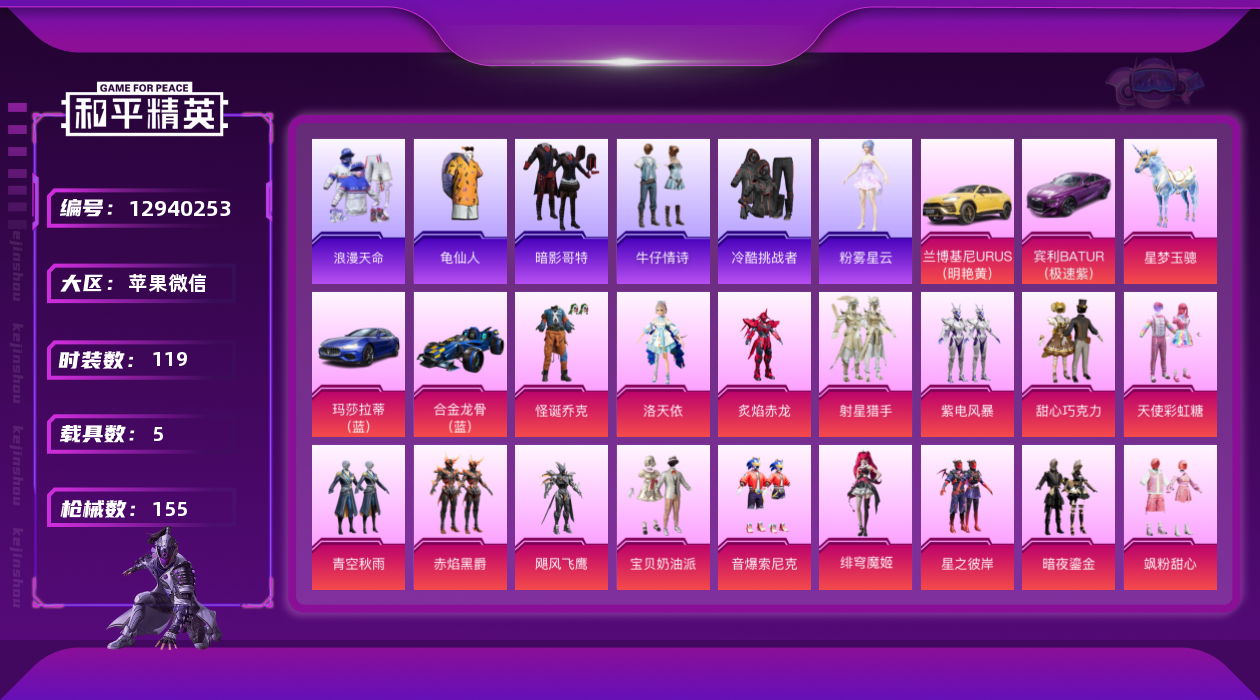[12940253]素材身法号/M416-至情至圣(九级)/无敌战神框1/绝世印记1 苹果 微信-无敌战神框-19粉装-19特效枪-5载具-5粉色飞行器-6.8w热力值-6王牌印记-119套装-155枪皮【热门品类】:粉装-怪诞乔克,粉装-梦幻火箭,粉装-音爆索尼克,套装-浪漫天命,套装-赤蝎幽灵,套装-都市猎人,套装-派对舞王,套装-龟仙人,套装-暗影哥特,小丑红鼻头【粉色载具】:兰博基尼URUS(明艳黄),玛莎拉蒂Ghibli(蓝),宾利BATUR(极速紫),合金龙骨(蓝),星梦玉骢【粉色套装】:粉装-数码大师,粉装-怪诞乔克,粉装-甜心巧克力,粉装-宝贝奶油派,粉装-天使彩虹糖,粉装-梦幻火箭,粉装-星之彼岸,粉装-炙焰赤龙,粉装-飓风飞鹰,角色-洛天依,粉装-赤焰黑爵,粉装-紫电风暴,粉装-青空秋雨,粉装-暗夜鎏金,粉装-音爆索尼克,粉装-飒粉甜心,粉装-炫光之旅,粉装-射星猎手,角色-绯穹魔姬【粉色枪皮等级】:AKM-甜心宝贝(五级),AKM-星际浪客(一级),SCAR-L-天蓬元帅(六级),M416-风花雪月(一级),M416-至情至圣(九级),GROZA-焦糖拿铁(四级),AUG-星之彼岸(一级),AUG-星梦奇缘(三级),M762-冷魅冰骑(四级),UMP45-启明星(四级),Vector-飒粉甜心(四级),野牛-青空秋雨(四级),P90-能量风暴(四级),Kar98K-未来歌姬(二级),M24-莲影清波(一级),SPAS-12-音爆索尼克(四级),DP-28-暗夜鎏金(四级),DP-28-豹影疾电(五级),MG3-洛神天依(四级)【粉色飞行器】:星之彼岸飞行器,纯梦嫁纱飞行翼,全功率超战飞行器