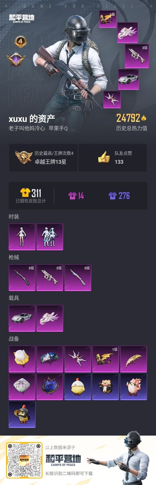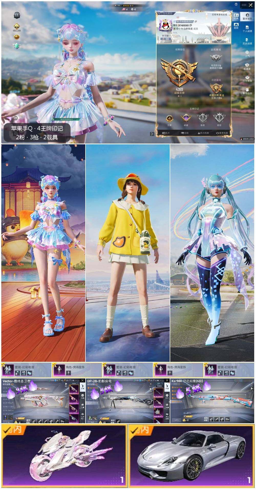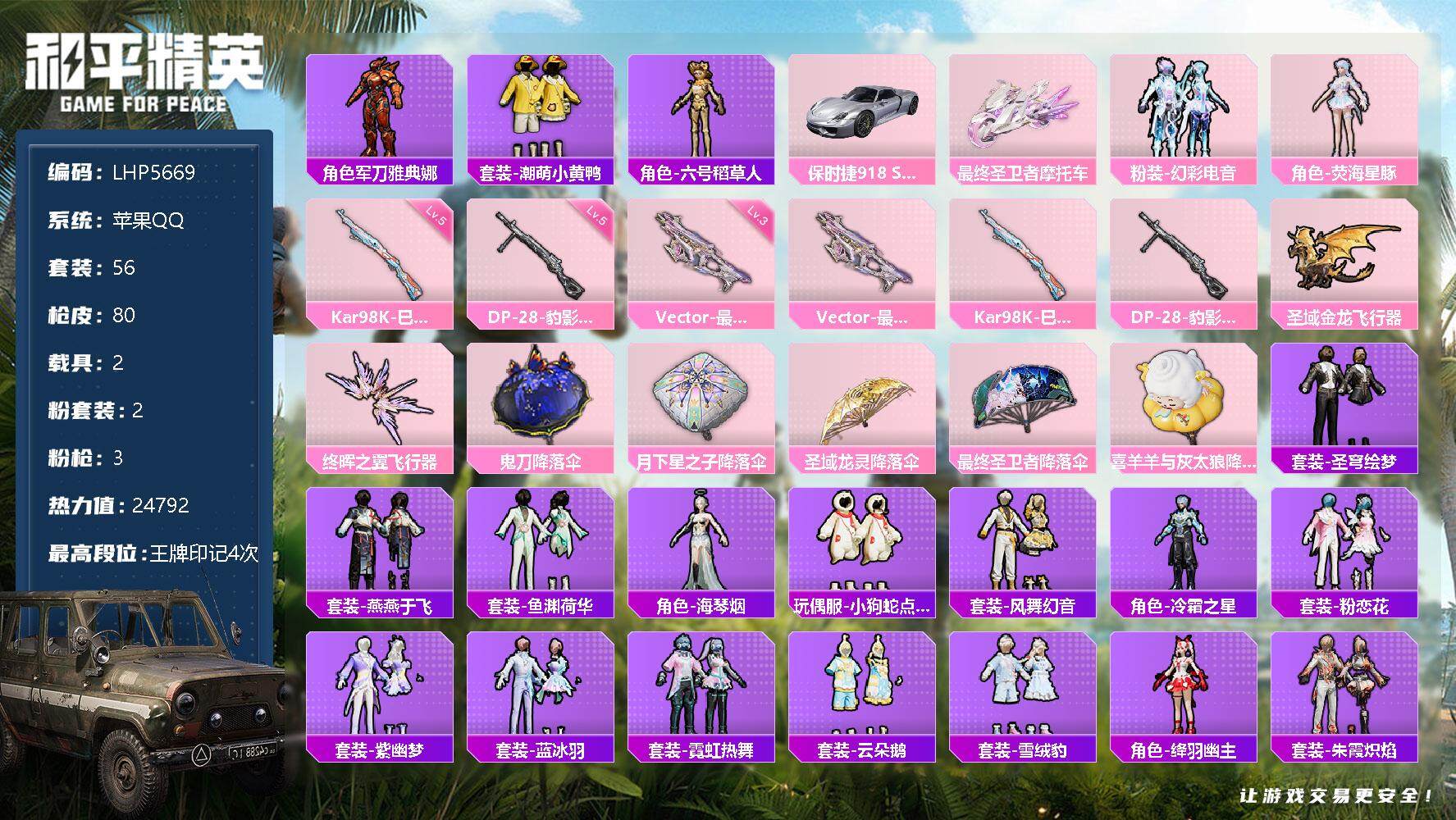 [12940209]苹果 手Q-2粉装-3特效枪-2载具-2粉色飞行器-2.4w热力值-4王牌印记-56套装-80枪皮【热门品类】:角色-军刀雅典娜,套装-潮萌小黄鸭,角色-六号稻草人【粉色载具】:保时捷918 Spyder(液态银),最终圣卫者摩托车【粉色套装】:粉装-幻彩电音,角色-荧海星豚【粉色枪皮等级】:Vector-最终圣卫者(三级),Kar98K-巳巳如意(五级),DP-28-豹影疾电(五级)【粉色飞行器】:圣域金龙飞行器,终晖之翼飞行器