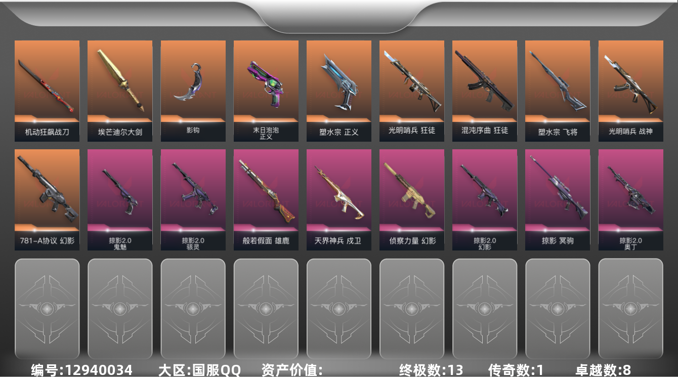 [12940034]【套装】:2025全球冠军赛套装,掠影//2.0套装 【英雄】:幻棱,炼狱,维斯,暮蝶,钛狐,壹决,铁臂,捷风,雷兹,幽影,不死鸟,贤者,猎枭,蝰蛇,零,芮娜,奇乐,尚勃勒,霓虹,斯凯,夜露,星礈,K/O,海神,盖可,黑梦,钢锁 【近战 武器】:近战武器-2025全球冠军赛 蝴蝶刀,近战武器-影钩,近战武器-埃芒迪尔大剑,近战武器-机动狂飙 战刀 【狂徒】:狂徒-2025全球冠军赛,狂徒-光明哨兵,狂徒-混沌序曲 【幻影】:幻影-781-A协议,幻影-侦察力量,幻影-掠影//2.0 【戍卫】:戍卫-天界神兵 【冥驹】:冥驹-掠影 【飞将】:飞将-塑水宗 【战神】:战神-光明哨兵 【奥丁】:奥丁-掠影//2.0 【雄鹿】:雄鹿-般若假面 【骇灵】:骇灵-掠影//2.0,骇灵-无限竞技 【正义】:正义-塑水宗,正义-末日泡泡,正义-纳米打击 【鬼魅】:鬼魅-掠影//2.0,鬼魅-星云暗涌 【卡面】:终章:激斗汉堡 卡面,进入射程 卡面,《双城之战》拥抱 卡面,精灵大战 卡面,欢迎来到底城 卡面,南瓜盛典 卡面,无畏契约:暮蝶 卡面,修车达人 卡面,热舞环节 卡面,正义的化身 卡面,音熊登场 卡面,树懒大作战 卡面,红鳞松叶 卡面,Clutch 卡面,零点嗅探设计图 卡面,无畏契约GO!第一卷:芮娜 卡面,无畏契约GO!第一卷:零 卡面,化茧成蝶 卡面,《双城之战》金克丝 卡面,钢锁vs盖可 卡面,代号红色 卡面,新兵报到 卡面,V契约 卡面,无畏契约 卡面 【喷漆】:嗨宝南瓜灯 喷漆,嘭! 喷漆,都算到了 喷漆,控场勿近 喷漆,伤心心 喷漆,小丑猫 喷漆,熊抱 喷漆,买装还是存钱 喷漆,无畏契约GO!第一卷:奇乐 喷漆,胜利属于无畏契约 喷漆,GLHF 喷漆,无畏契约 喷漆 【挂饰】:终章:猫猫木乃伊 挂饰,悠闲鸡块 挂饰,伞绳 挂饰,《双城之战》小蛋糕 挂饰,第九季//第三幕 纪念币 挂饰,工具腰带 挂饰,无畏契约GO!第一卷 零 挂饰,熔岩灯 挂饰,第九季//第二幕 纪念币 挂饰,第八季//第三幕 纪念币 挂饰,天外飞客 挂饰,无畏契约 纪念币 挂饰