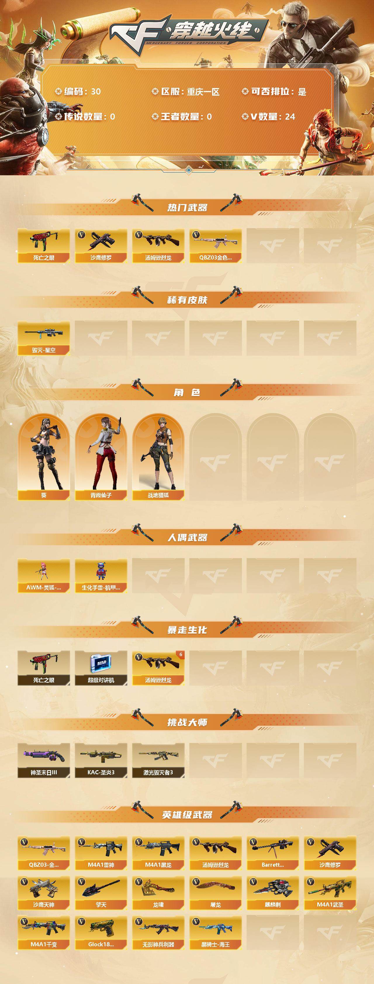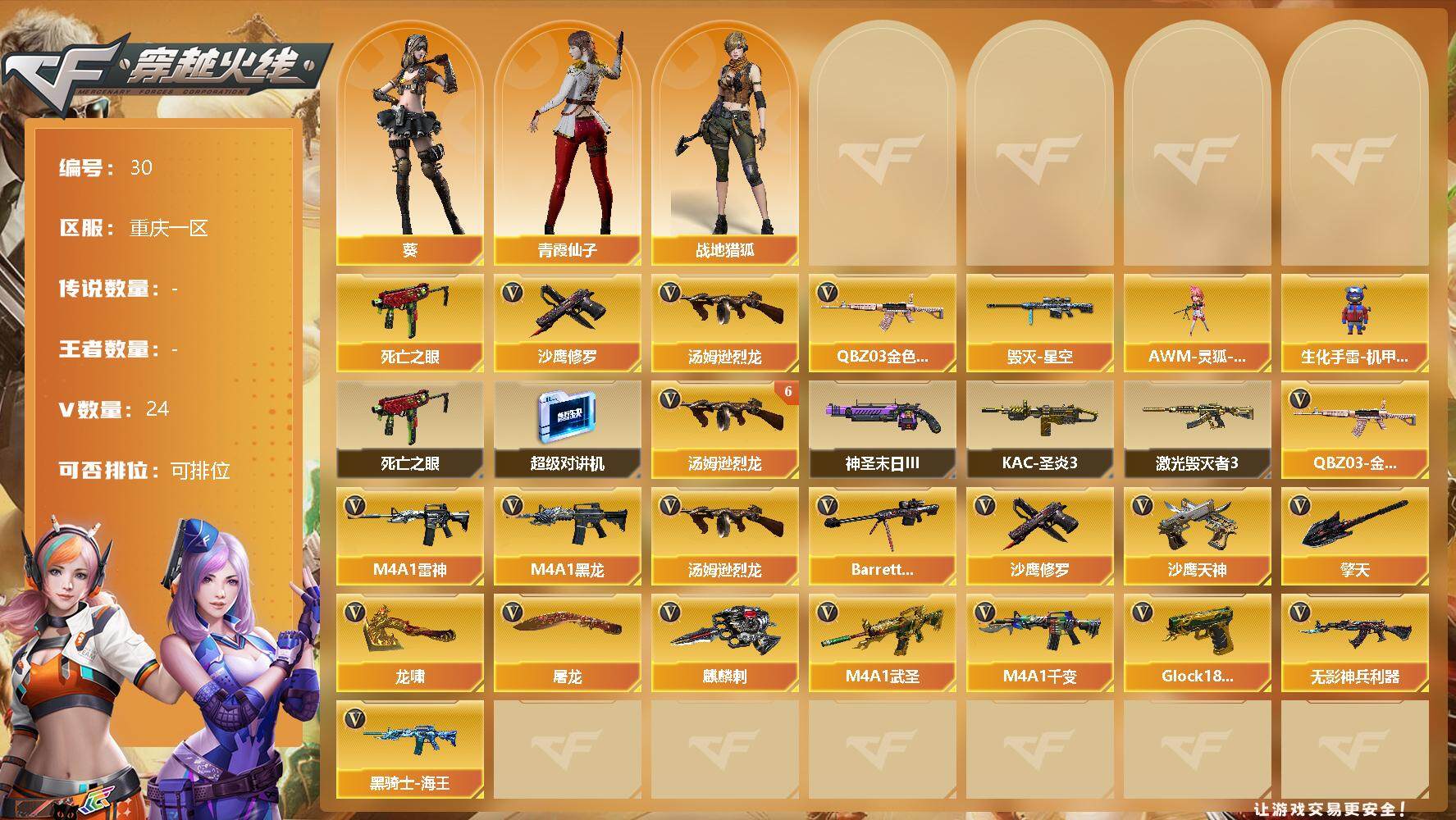 [12940373]【30】22V/100级/元帅/2英雄/QBZ03-金色蔷薇/死亡之眼/汤姆逊-烈龙/沙鹰-修罗/毁灭-星空/葵/战地猎狐/青霞仙子/AWM-灵狐-15周年嘉年华/生化手雷-机甲核心/超级对讲机/6烈龙/神圣爆裂者-末日/KAC-圣炎切割者/激光毁灭者/M4A1-武圣/Glock18-武圣/无影-神兵利器/M4A1-雷神/M4A1-黑龙/Barrett-毁灭/M4A1-千变/黑骑士-海王/沙鹰-天神/麒麟刺/擎天/龙啸/屠龙