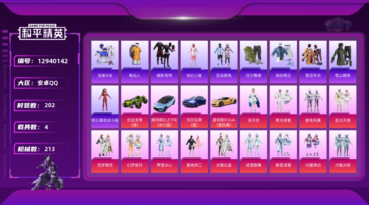 [12940142]素材身法号 安卓 手Q-31粉装-10特效枪-4载具-4粉色飞行器-9.9w热力值-14王牌印记-202套装-213枪皮【热门品类】:粉装-雪国幻梦,粉装-梦幻火箭,粉装-童趣迷兔,套装-浪漫天命,套装-深海小丑鱼,套装-小丑鱼,套装-奇异狩猎者,角色-军刀雅典娜,套装-龟仙人,套装-暗影哥特,套装-浪漫波比,套装-粉红小猪【粉色载具】:路特斯EVIJA(星际黄),路特斯ELETRE(冰川蓝),玛莎拉蒂Ghibli(蓝),合金龙骨(绿)【粉色套装】:粉装-雪国幻梦,粉装-梦幻火箭,粉装-冰霜白皇,粉装-童趣迷兔,粉装-炙焰红王,粉装-香水柠檬,粉装-飓风飞鹰,粉装-蜜桃特工,粉装-蝶舞蔷薇,角色-洛天依,粉装-海渊国主,角色-2号机款机体服,粉装-青葱仙萝,粉装-幻梦音符,粉装-绚丽摇曳,粉装-闪耀律动,粉装-冷魅冰骑,粉装-赤焰黑爵,粉装-紫电风暴,粉装-筑梦精灵,粉装-炙焰牛王,粉装-圣光天使,角色-复仇流浪者,粉装-绒雪飘舞,粉装-傲雪凌霜,粉装-霁雪冰心,粉装-彩虹甜喵,粉装-霞光圣骑,粉装-寒光使者,角色-烟云彩露,角色-奇迹舞步 美琪【粉色枪皮等级】:AKM-梦之光华(七级),SCAR-L-童趣迷兔(七级),SCAR-L-青春物语(五级),M416-五爪金龙(七级),UZI-筑梦精灵(七级),UMP45-雪国精灵(七级),Vector-环太平洋(七级),Kar98K-巳巳如意(五级),SLR-暗夜玫瑰(四级),DP-28-豹影疾电(四级)【粉色飞行器】:梦幻火箭飞行器,幻梦音符飞行器,冷魅冰骑飞行器,星夜魔法师飞行翼