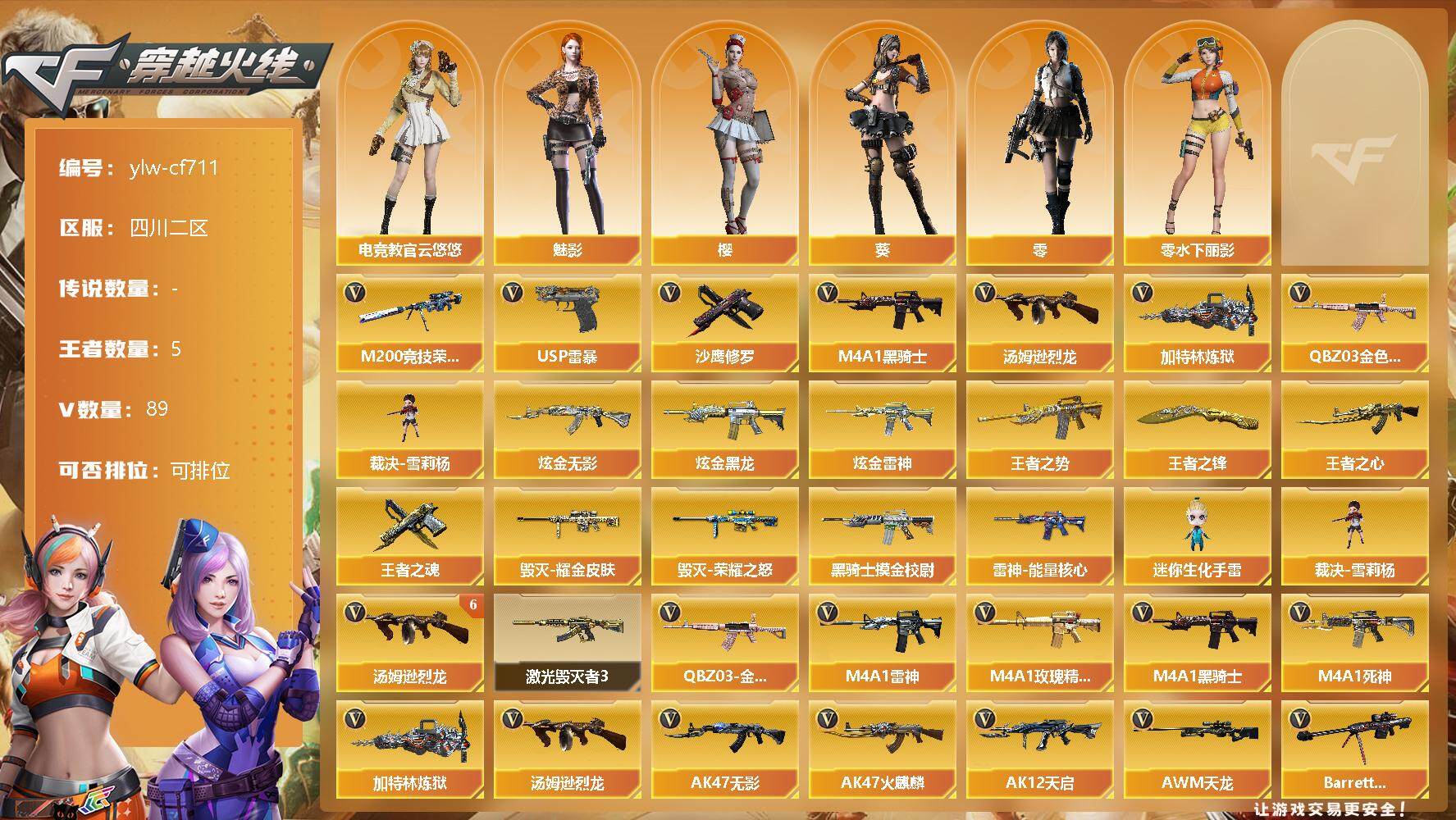 [12940484]四川二区-89V-5王者-3炫金 【热门武器】:QBZ03-金色蔷薇,M200-竞技荣光,M4A1-黑骑士,汤姆逊-烈龙*6,加特林-炼狱,裁决-雪莉杨,USP-雷暴,沙鹰-修罗*4 【王者炫金武器】:炫金无影,炫金黑龙,炫金雷神,王者之势,王者之心,王者之魂,王者之锋 【稀有皮肤】:雷神-能量核心,黑骑士-摸金校尉,毁灭-荣耀之怒,毁灭耀金皮肤 【角色】:零-水下丽影,电竞教官-云悠悠,零,葵,樱,魅影 【人偶武器】:裁决-雪莉杨,迷你生化手雷 【挑战大师】:激光毁灭者III 【英雄级武器】:QBZ03-云龙,COP 357-云龙*2,M200-竞技荣光,柯尔特-竞技荣光,擎天-竞技荣光*2,高爆手雷-竞技荣光*9,烟雾弹-竞技荣光*9,闪光弹-竞技荣光*8,USP-雷暴,斩神刀-雷暴,QBZ03-金色蔷薇,M4A1-雷神,M4A1-玫瑰精灵,M4A1-黑骑士,M4A1-死神,加特林-炼狱,汤姆逊-烈龙*6,AK47-无影,AK47-火麒麟,AK12-天启,AWM-天龙,Barrett-毁灭,Barrett-极光*3,黑武士-锦绣游龙,沙鹰-天神,沙鹰-修罗*4,麒麟刺,擎天*2,龙啸,屠龙*5 【特殊枪械】:1黑骑士,6烈龙