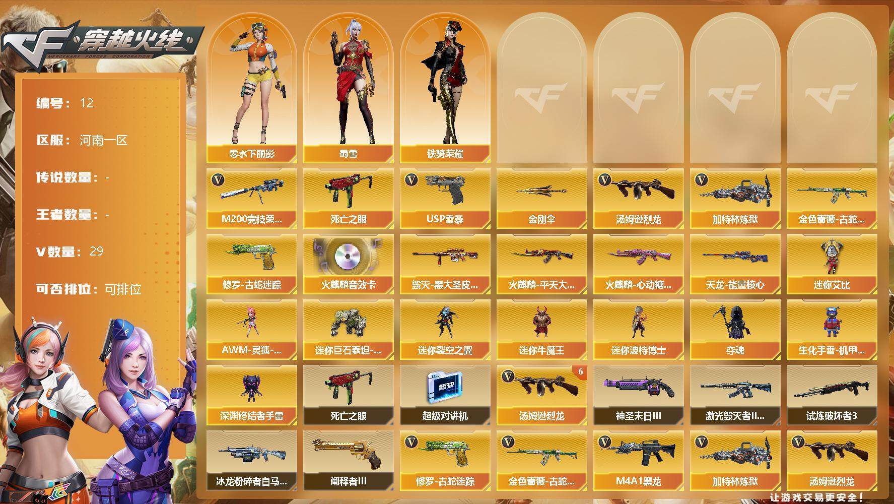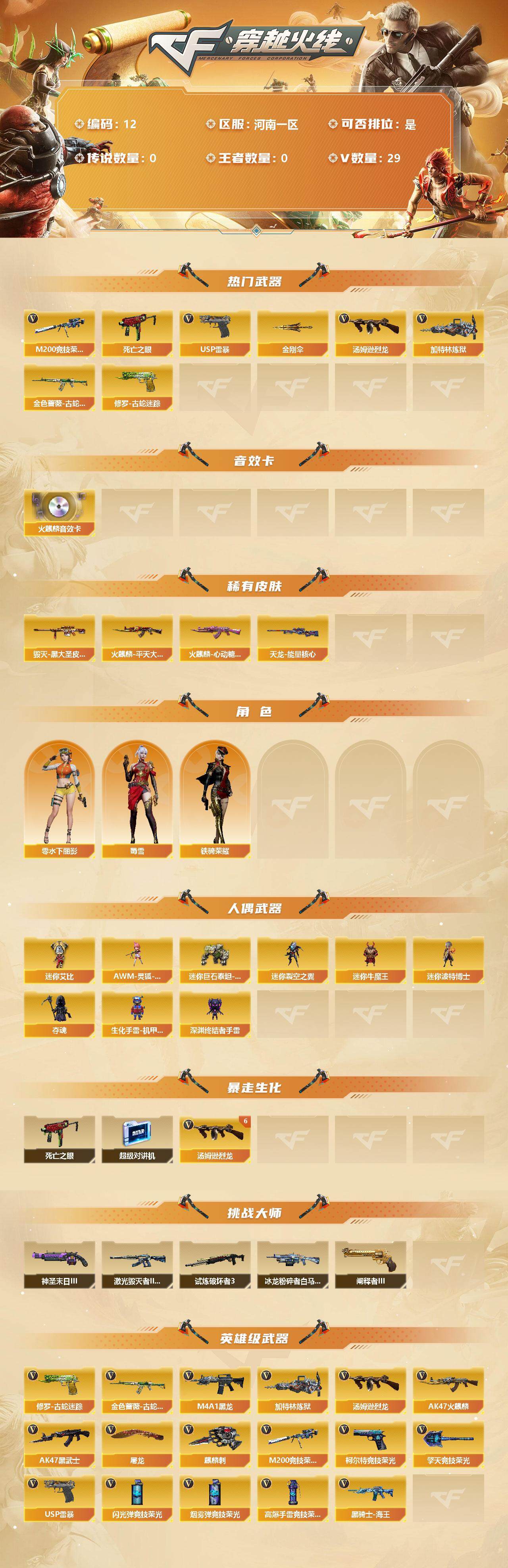 - [12617207]广东三区-55V-1王者-0炫金 【热门武器】:QBZ03-金色蔷薇,M200-幻神,金色蔷薇-古蛇迷踪,修罗-古蛇迷踪,荣耀世冠-火麒麟,Kar98K-星神,M4A1-黑骑士*5,加特林-炼狱,COP 357-幻灵,沙鹰-修罗*4 【音效卡】:M4A1-黑骑士音效卡,Barrett-毁灭音效卡 【稀有皮肤】:M200-幻神-黄忠皮肤,幻神-宠儿-2021MVP,幻神-曹操 皮肤,幻神-AG-CFPL S24冠军 皮肤,星神-漫游,QBZ03-冠军之薇,雷神-冠军之魄,雷神-R.LGD-CFPLS18冠军,火麒麟-战神关羽,黑龙-冠军之武,毁灭-暗月,毁灭-星空 【角色】:王者潘多拉,鹰,战地猎狐,铁骑荣耀 【人偶武器】:AWM-灵狐-15周年嘉年华,迷你深渊冰龙,迷你裂空之翼,迷你波特博士*2,迷你曼提柯尔,夺魂,迷你火种,生化手雷-机甲核心,深渊终结者手雷 【暴走生化】:超级对讲机 【挑战大师】:神圣爆裂者III,机甲撕裂者III,神圣爆裂者-末日III,KAC-圣炎切割者III,惩戒者III,试炼破坏者III,VEPR-12-金魔,激光毁灭者III-白马银枪,冰龙粉碎者-白马银枪 【英雄级武器】:烟雾弹-竞技荣光*2,闪光弹-竞技荣光*2,COP 357-幻灵,幻灵之锋,荣耀世冠-火麒麟,QBZ03-金色蔷薇,金色蔷薇-古蛇迷踪,无影-神兵利器,M4A1-雷神,M4A1-黑龙,M4A1-黑骑士*5,加特林-炼狱,AK47-火麒麟,AN94-超新星,Barrett-毁灭*2,AWM-裁决,AA-12-雷霆,Kar98K-星神,M200-幻神,黑骑士-海王,M4A1-赤狱骑士,修罗-古蛇迷踪,沙鹰-修罗*4,麒麟刺*3,屠龙,擎天-云海游龙,屠龙-云海游龙 【特殊枪械】:5黑骑士,1炼狱