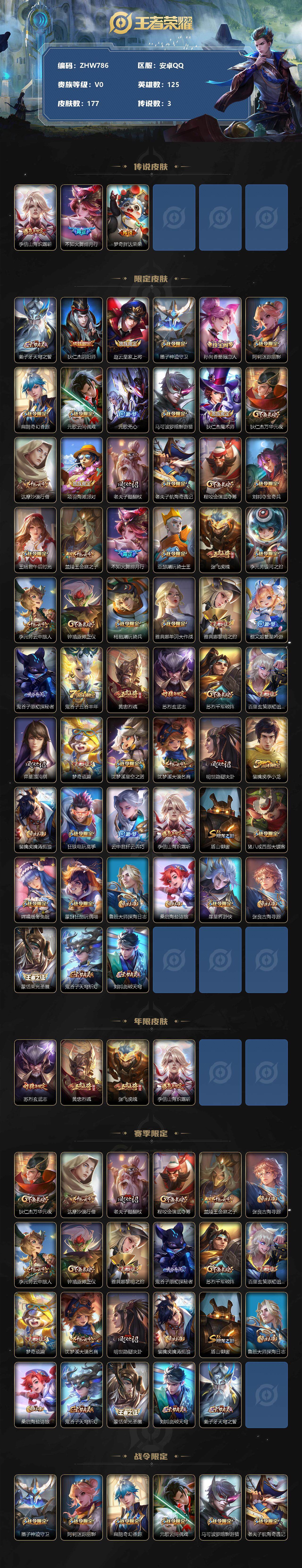 - [11437520]V7 1典藏 12传说 120英雄 203皮肤 可修改实名 优质装备:鸣剑·曳影,云鹰飞将(小将军),一念神魔,云霓雀翎,末日机甲-孙尚香(绿蚂蚱),仲夏夜之梦(大飞蛾),零号·赤焰,挚爱之约 珍宝阁皮:玩趣恶龙 限定皮:白虎志(电光耗子),凤求凰(白切鸡),异界灵契(白毛香),时雨天司(水龙头),神威(电光马子),遇见飞天,高山流水,梁祝,天狼绘梦者,李小龙,朱雀志(守约年限),一生所爱,大圣娶亲,天魔缭乱,冰霜恋舞曲,时之祈愿-云中君,玉兔公主,山海·玄木吟(马可年限) 史诗皮:紫霞仙子,黄金分割率,永昼,江河有灵,魅语,冰冠公主,偶像歌手,电玩·爆裂旋风,龙骑士(小龙虾),末日机甲-吕布,乱世虎臣,修罗,水果甜心,心灵骇客,德古拉伯爵,暗隐猎兽者,鬼剑武藏,纤云弄巧,繁星吟游(呼啦呼啦),拒霜思,缤纷独角兽,乘风破浪,逐浪之夏,水晶猎龙者,金属风暴,原初追逐者,圣诞恋歌,鹰眼统帅,魅力维加斯,黎明之约,无心,未来纪元-赵云