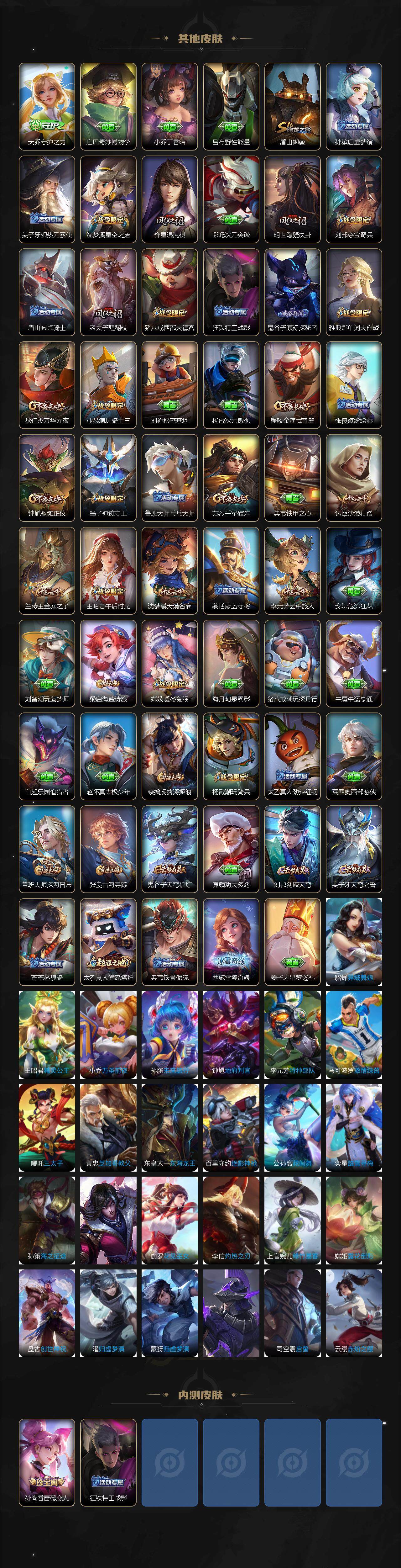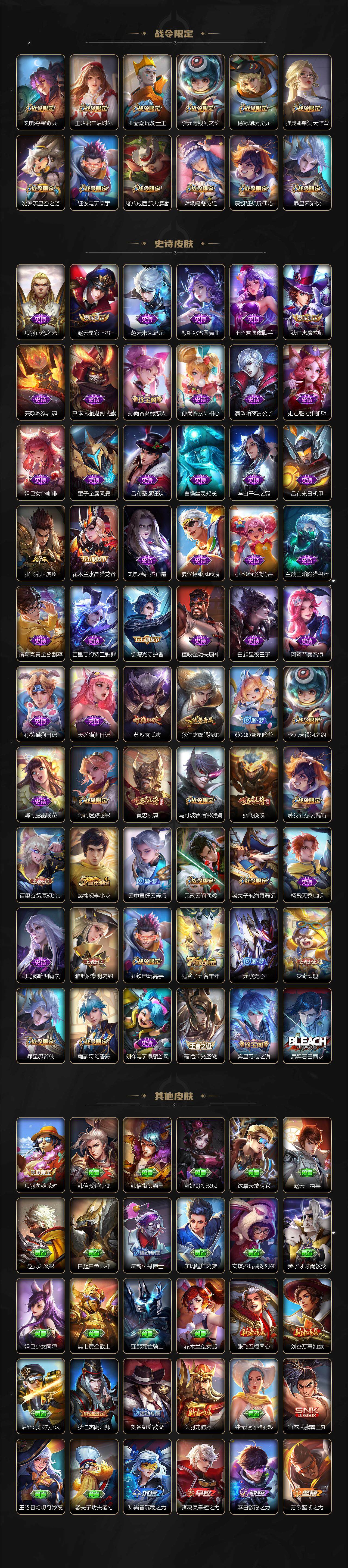 【限定皮肤】:姜子牙天穹之誓,狄仁杰阴阳师,赵云皇家上将,墨子神迹守卫,孙尚香蔷薇恋人,阿轲迷踪丽影,扁鹊奇幻香踪,元歌云间偶戏,元歌无心,马可波罗暗影游猎,狄仁杰魔术师,狄仁杰万华元夜,达摩沙漠行僧,项羽海滩派对,老夫子醍醐杖,老夫子航海奇遇记,程咬金演武夺筹,刘邦夺宝奇兵,王昭君午后时光,兰陵王金庭之子,不知火舞绯月行,亚瑟潮玩骑士王,张飞虎魄,李元芳银河之约,李元芳云中旅人,钟馗驱傩正仪,杨戬潮玩骑兵,雅典娜单词大作战,雅典娜黎明之约,蔡文姬繁星吟游,鬼谷子原初探秘者,鬼谷子五谷丰年,黄忠烈魂,苏烈玄武志,苏烈千军破阵,百里玄策原初追逐者,弈星混沌棋,梦奇顽趣,沈梦溪星空之诺,沈梦溪大漠名商,明世隐疑决卦,裴擒虎李小龙,裴擒虎擒涛扼浪,狂铁电玩高手,云中君纤云弄巧,李信山海炽霜斩,盾山御銮,猪八戒西部大镖客,嫦娥暖冬兔眠,蒙犽狂想玩偶喵,鲁班大师探海日志,桑启海盐诗旅,暃星界游侠,张良古海寻踪,蒙恬荣光圣徽,鬼谷子天穹祈灯,刘邦剑破天穹