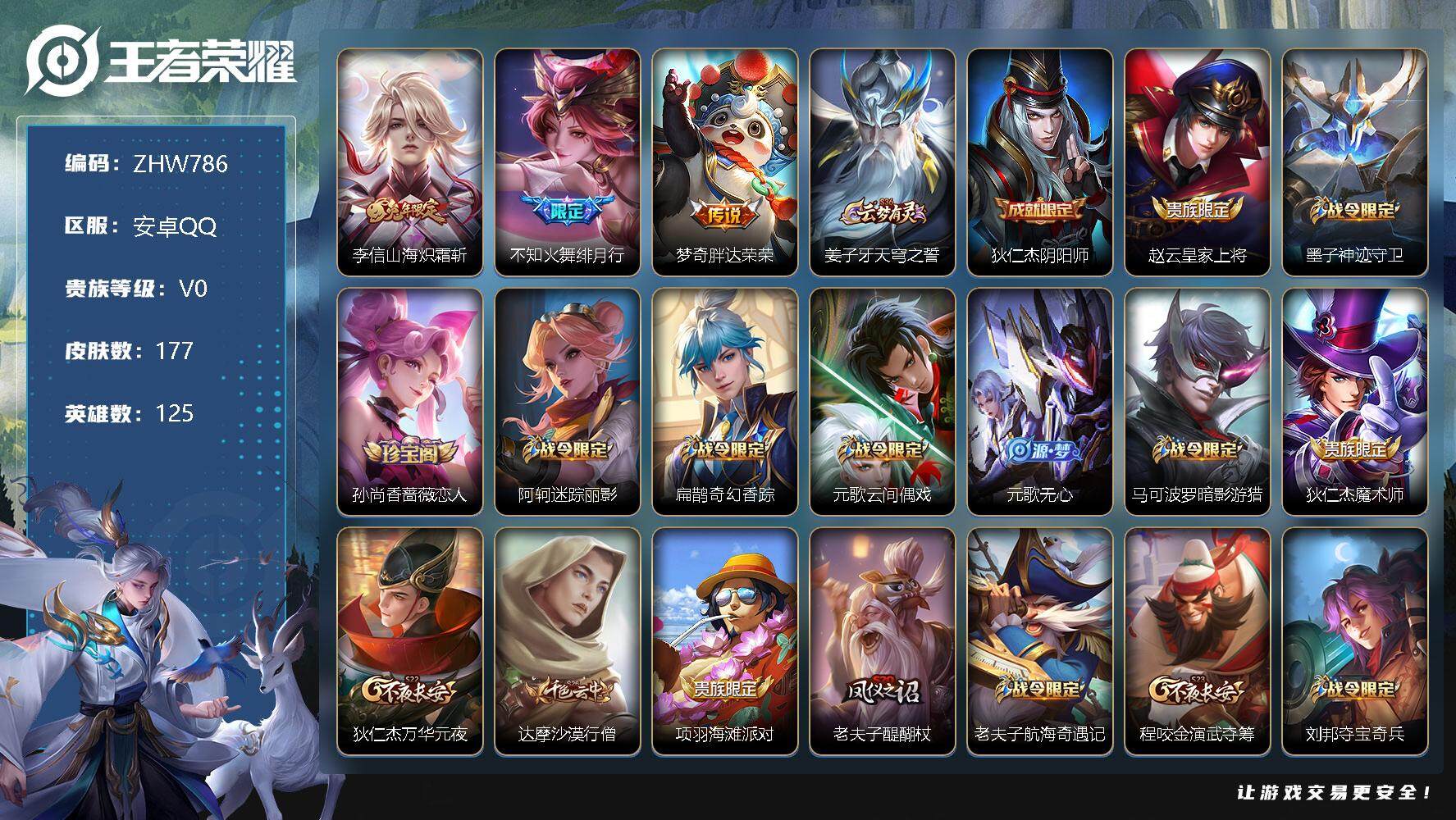 [12940326]【特价急出/详情看图】安卓Q-V0-荣耀黄金I段位-125英雄-177皮肤-3传说-60史诗