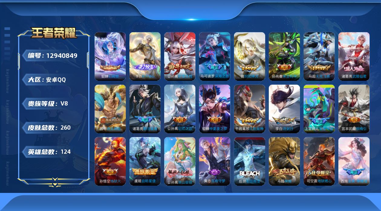 [12940849]安卓Q-V8-永恒钻石I段位-124英雄-260皮肤-1典藏-0珍品无双-1无双-0珍品传说-16传说-77史诗