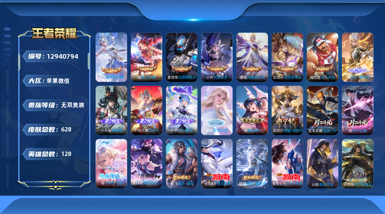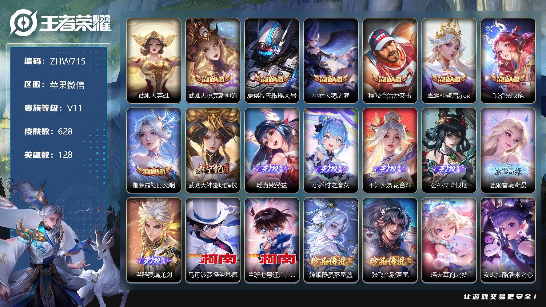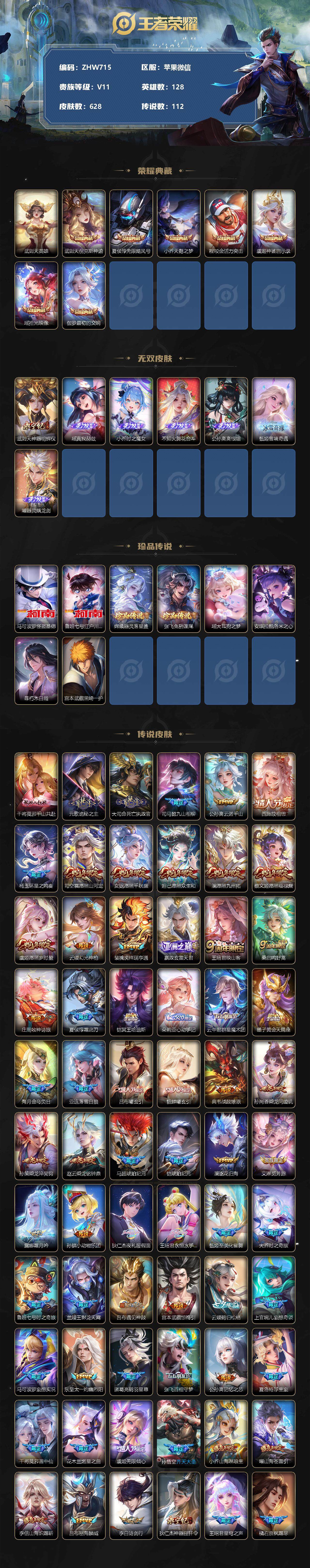 [12940794]苹果WX-V11-最强王者段位-128英雄-628皮肤-7典藏-0珍品无双-7无双-8珍品传说-112传说-221史诗