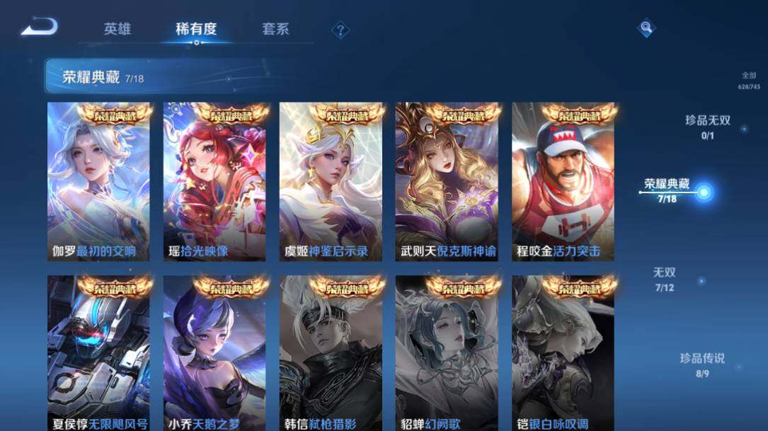 【荣耀典藏】:武则天英雄,武则天倪克斯神谕,夏侯惇无限飓风号,小乔天鹅之梦,程咬金活力突击,虞姬神鉴启示录,瑶拾光映像,伽罗最初的交响