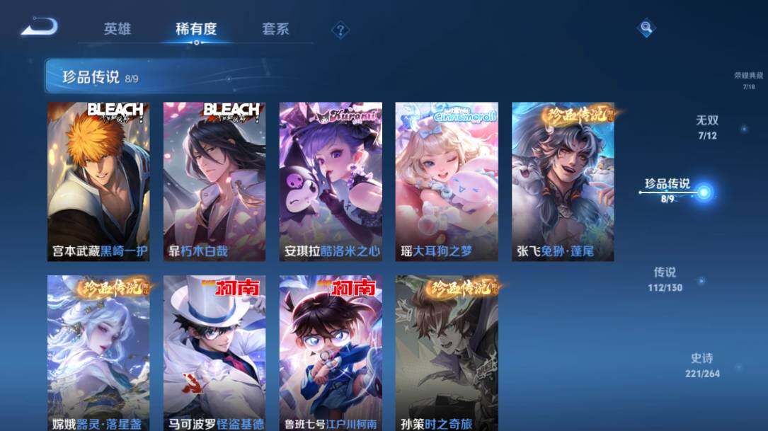 【珍品传说】:马可波罗怪盗基德,鲁班七号江户川柯南,嫦娥器灵落星盏,张飞兔狲蓬尾,瑶大耳狗之梦,安琪拉酷洛米之心,暃朽木白哉,宫本武藏黑崎一护