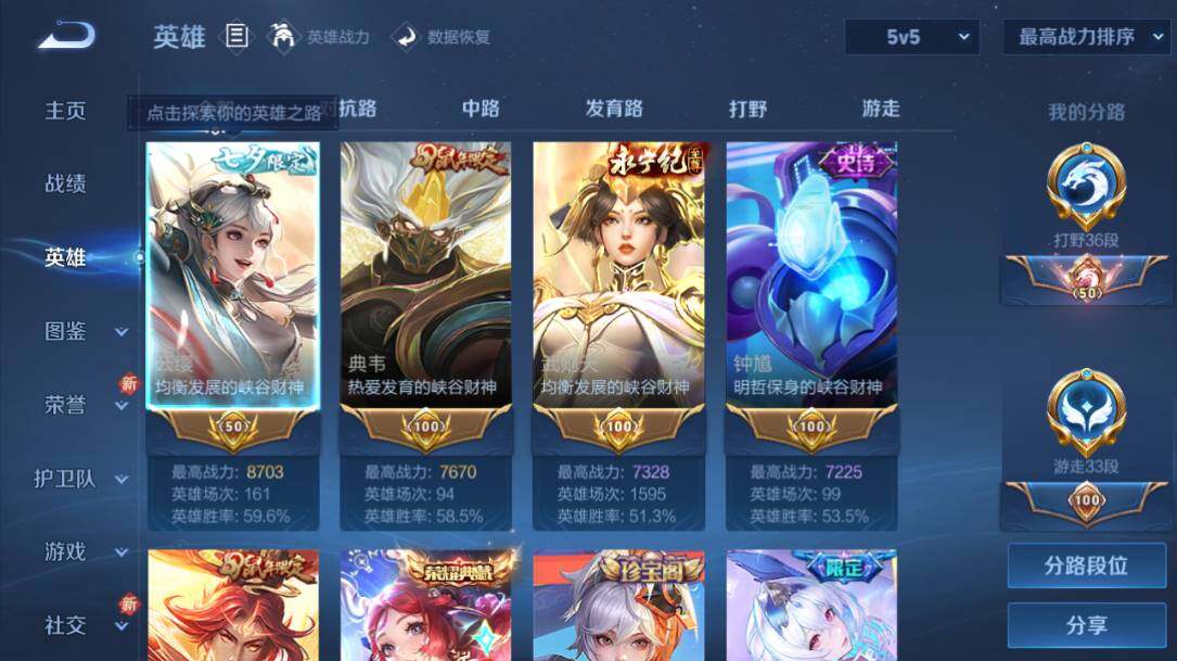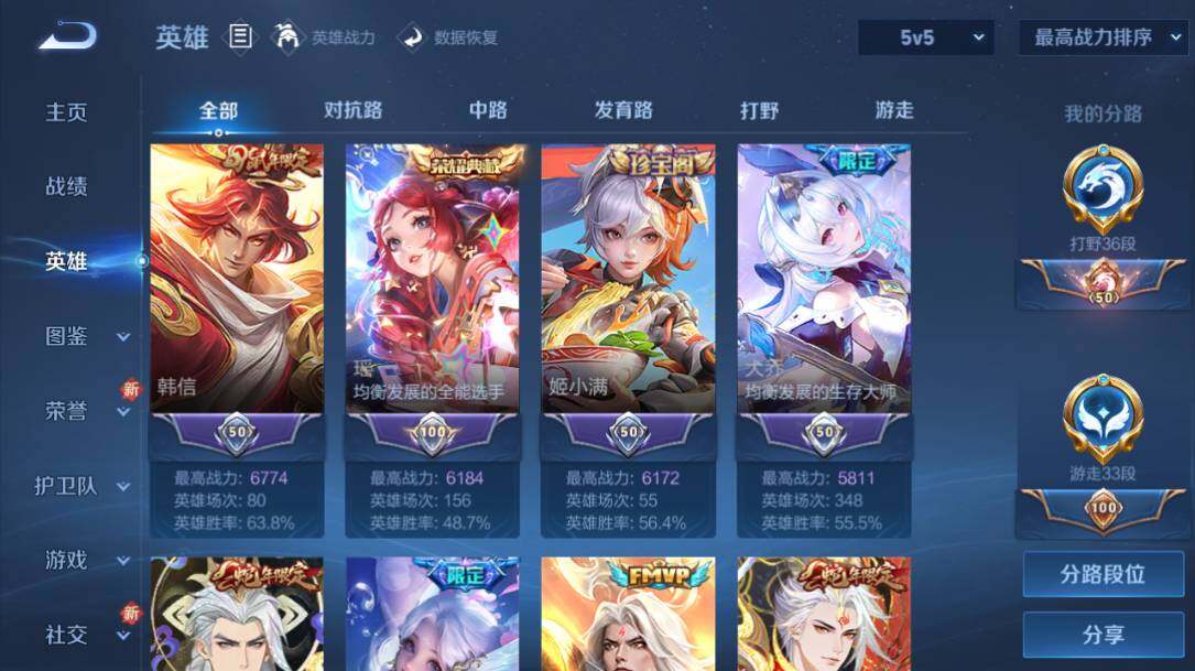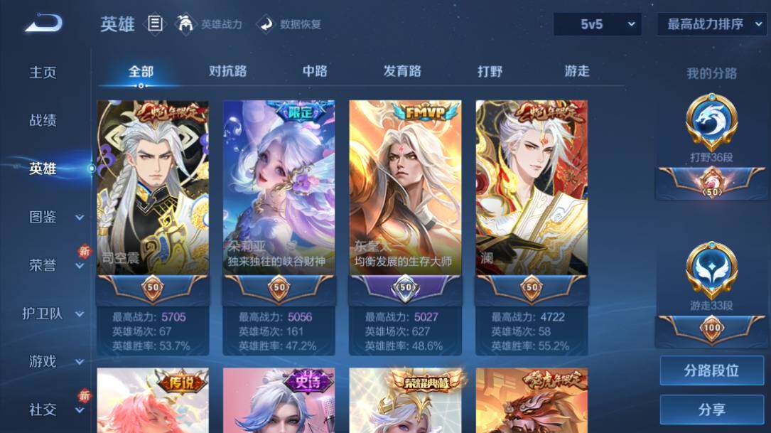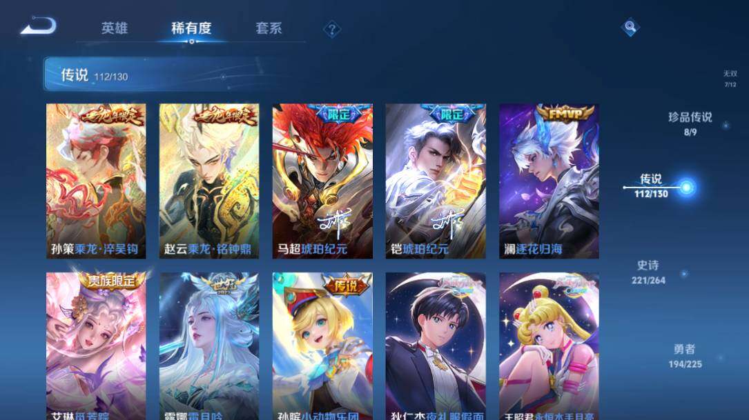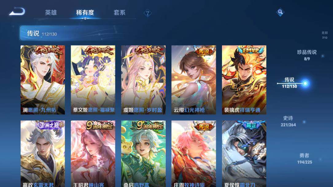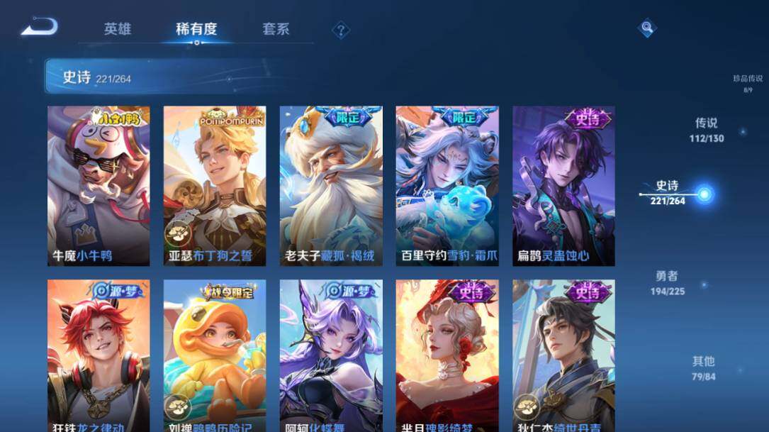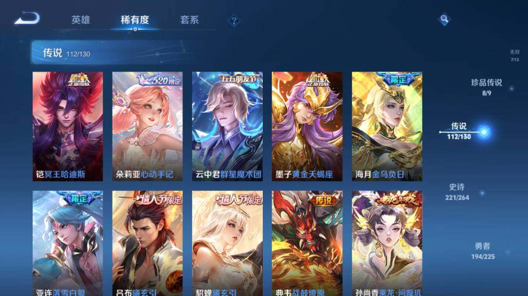 - PX_2068347-贵族等级: V7 英雄数: 123 皮肤数: 191 传说皮: 云鹰飞将,一念神魔,地狱火,山海·炽霜斩 限定皮: 李小龙,梁祝,神威,天狼绘梦者,大圣娶亲,傲雪梅枪,时之祈愿-瑶,山海·玄木吟