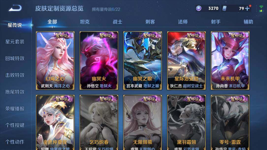 达摩黄金狮子座,张良黄金白羊座,干将莫邪久胜战神,铠绛天战甲,貂蝉猫影幻舞,曜云鹰飞将,镜炽阳神光,西施游龙清影,虞姬云霓雀翎,李信一念神魔,赵云淬星耀世,小乔音你心动,周瑜音你心动,刘备时之恋人,孙悟空零号·赤焰,李元芳飞鸢探春,王昭君乞巧织情,孙策末日机甲,蔡文姬花朝如约,孙策挚爱之约,大乔挚爱花嫁,马超无双飞将,孙尚香音你闪耀,狄仁杰神器·狴犴令,干将莫邪画中仙,夏洛特浮生妄,公孙离记忆之芯,张飞百相守梦,宫本武藏惊梅引,吕布遇见神鼓,大乔时之奇旅,鲁班七号时之奇旅,王昭君永恒水手月亮,狄仁杰夜礼服假面,孙膑小动物乐团,露娜霜月吟,艾琳觅芳踪,澜逐花归海,铠琥珀纪元,马超琥珀纪元,孙策乘龙·淬吴钩,赵云乘龙·铭钟鼎,孙尚香乘龙·问璇玑,典韦战鼓燎原,吕布曦玄引,貂蝉曦玄引,亚连落雪白狼,海月金乌负日,墨子黄金天蝎座,云中君群星魔术团,朵莉亚心动手记,铠冥王哈迪斯,庄周牧神诗旅,嬴政玄雷天君,裴擒虎祥瑞亨通,云缨幻光神枪,杨玉环星之鸣奏,西施续相思