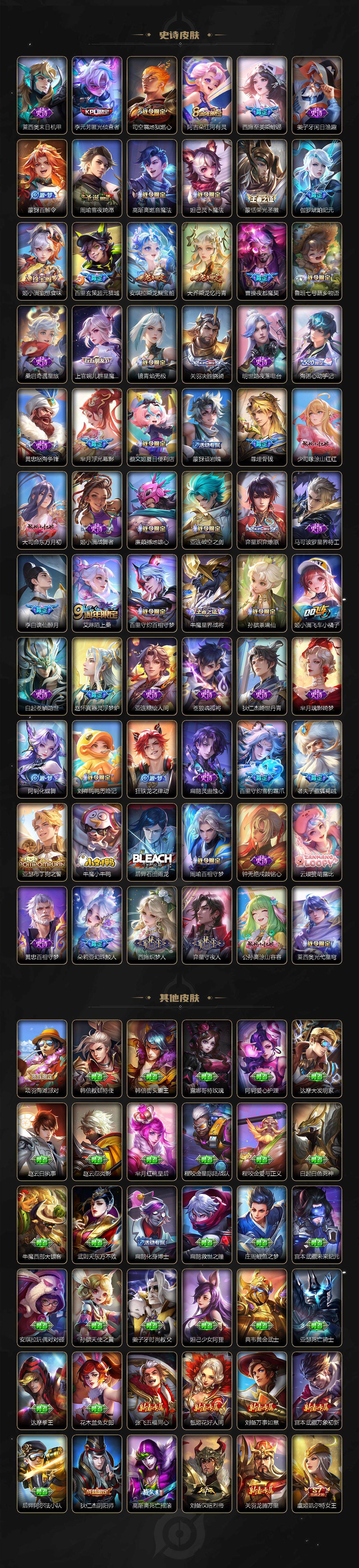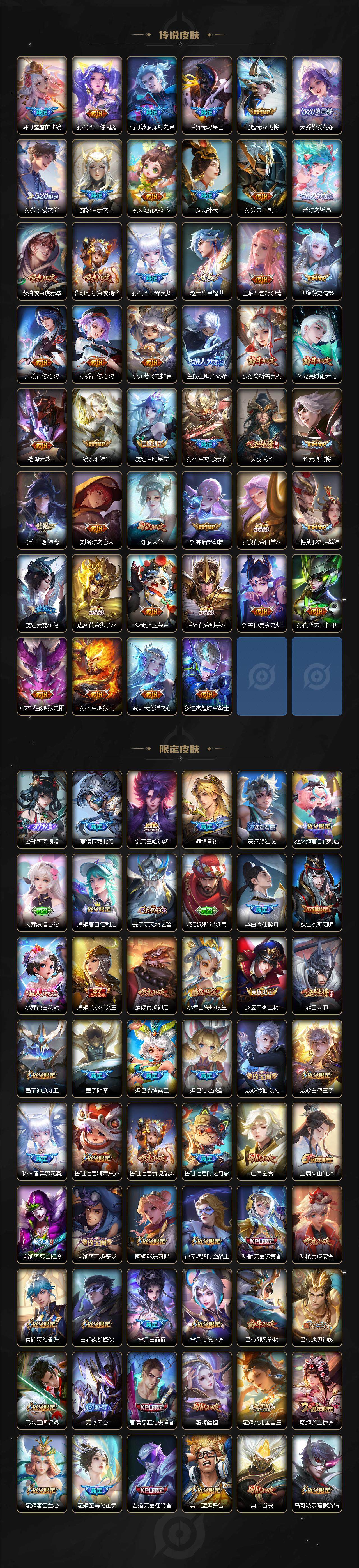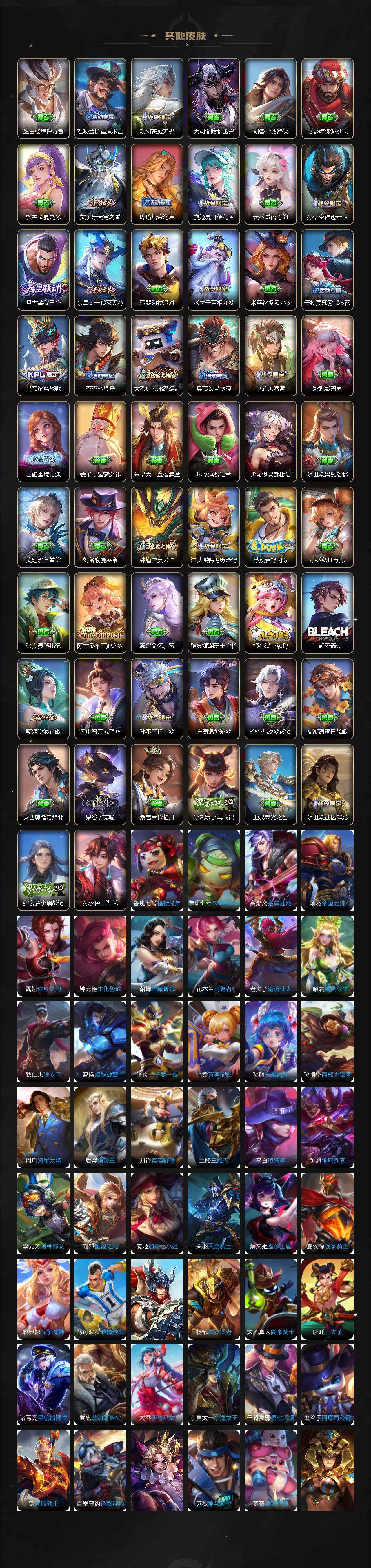 【英雄全皮】:廉颇全皮,小乔全皮,嬴政全皮,刘禅全皮,高渐离全皮,元歌全皮,甄姬全皮,狄仁杰全皮,达摩全皮,武则天全皮,司马懿全皮,姜子牙全皮,刘邦全皮,孙权全皮,王昭君全皮,朵莉亚全皮,娜可露露全皮,橘右京全皮,张飞全皮,杨玉环全皮,苍全皮,哪吒全皮,蔡文姬全皮,东皇太一全皮,鬼谷子全皮,黄忠全皮,梦奇全皮,瑶全皮,云中君全皮,李信全皮,猪八戒全皮,亚连全皮,大司命全皮,马超全皮,海月全皮,西施全皮,蒙犽全皮,鲁班大师全皮,蒙恬全皮,盘古全皮,阿古朵全皮,桑启全皮,夏洛特全皮,司空震全皮,云缨全皮,暃全皮,赵怀真全皮,莱西奥全皮,戈娅全皮,空空儿全皮,影全皮,海诺全皮,姬小满全皮,少司缘全皮