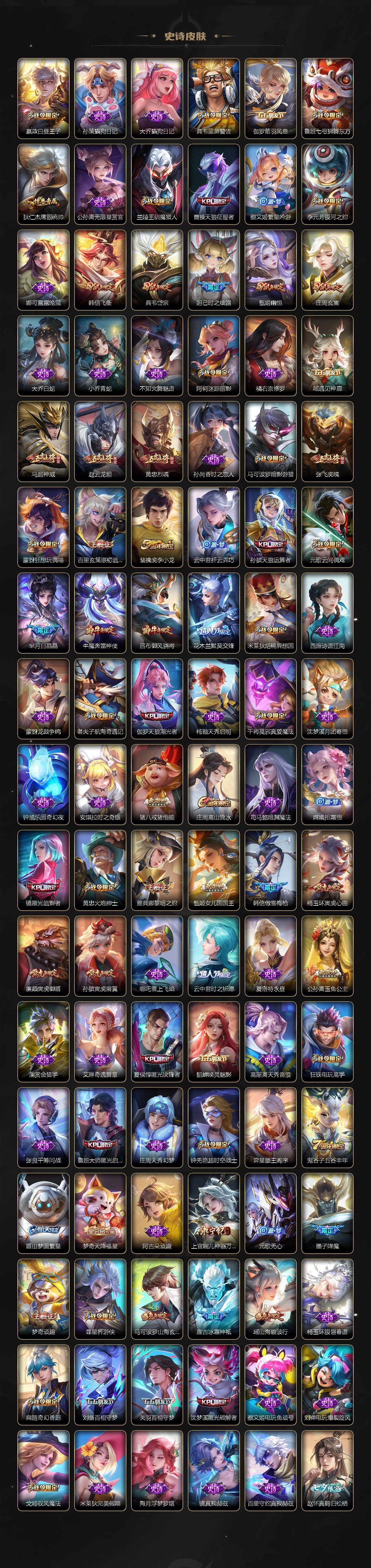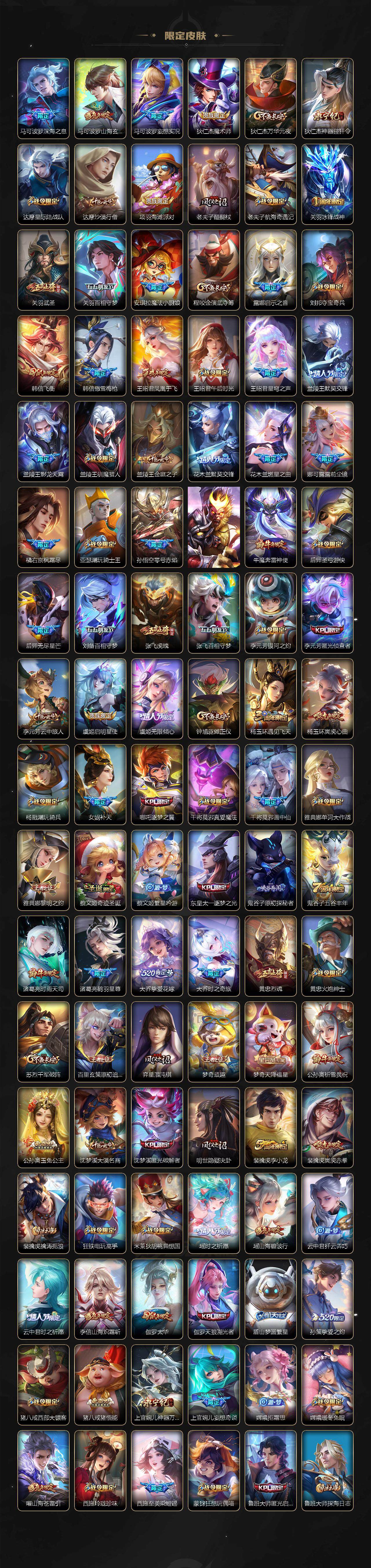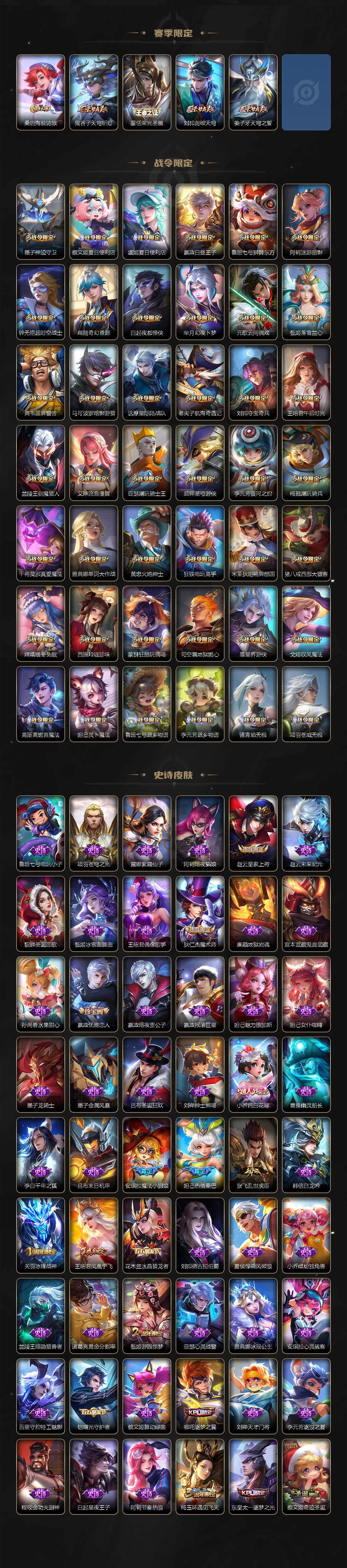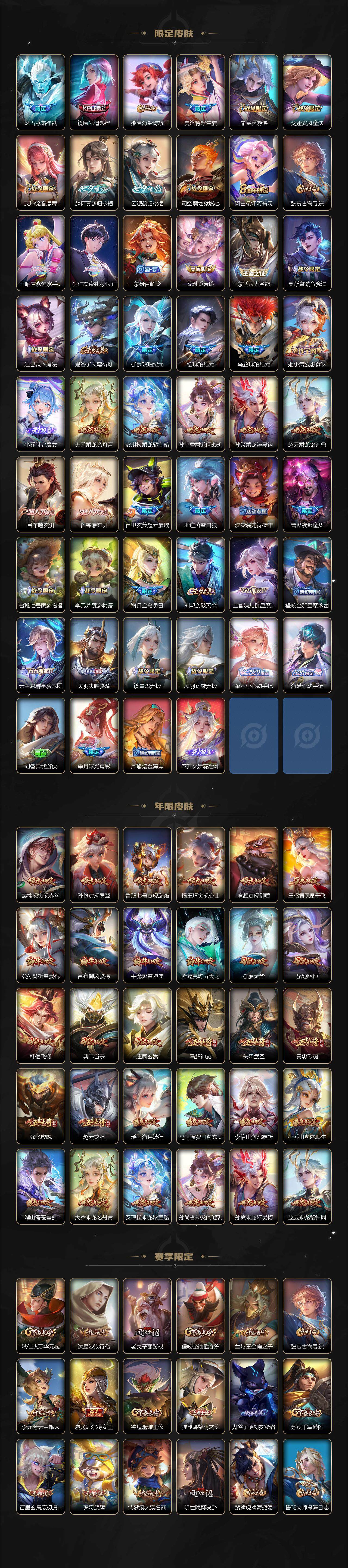 关羽冰锋战神,裴擒虎李小龙,牛魔奔雷神使,公孙离祈雪灵祝,吕布御风骁将,诸葛亮时雨天司,赵云龙胆,关羽武圣,黄忠烈魂,张飞虎魄,马超神威,庄周玄嵩,典韦岱宗,甄姬幽恒,韩信飞衡,伽罗太华,曹操天狼征服者,孙膑天狼运算者,伽罗天狼溯光者,哪吒逐梦之翼,东皇太一逐梦之光,王昭君凤凰于飞,小乔纯白花嫁,花木兰默契交锋,兰陵王默契交锋,妲己热情桑巴,蔡文姬奇迹圣诞,妲己时之彼端,芈月白晶晶,安琪拉魔法小厨娘,猪八戒猪悟能,廉颇寅虎·御盾,孙尚香异界灵契,甄姬女儿国国王,镜匿光追影者,韩信傲雪梅枪,鲁班七号寅虎·瑞焰,孙膑寅虎·展翼,杨玉环寅虎·心曲,裴擒虎寅虎·赤拳,云中君时之祈愿,瑶时之祈愿,女娲补天,公孙离玉兔公主,露娜启示之音,夏侯惇匿光决锋者,后羿无尽星芒,马可波罗深海之息,娜可露露前尘镜,橘右京枫霜尽,鲁班大师匿光启智者,王昭君星穹之声,上官婉儿神器·万象笔,盾山梦圆繁星,墨子降魔,李白诗剑行,马可波罗山海·玄木吟,盘古冰霜神祇,瑶山海·碧波行,兰陵王影龙天霄,西施至美·乘鲤谣,甄姬至美·化雀舞,夏侯惇霜北刀,桑启鸣野蒿,艾琳陌上桑,王昭君映山客,澜愿照·九州拓,蔡文姬愿照·福禄聚,虞姬愿照·岁时盈,司空震愿照·山河定,妲己愿照·众生和,女娲愿照·千秋盛