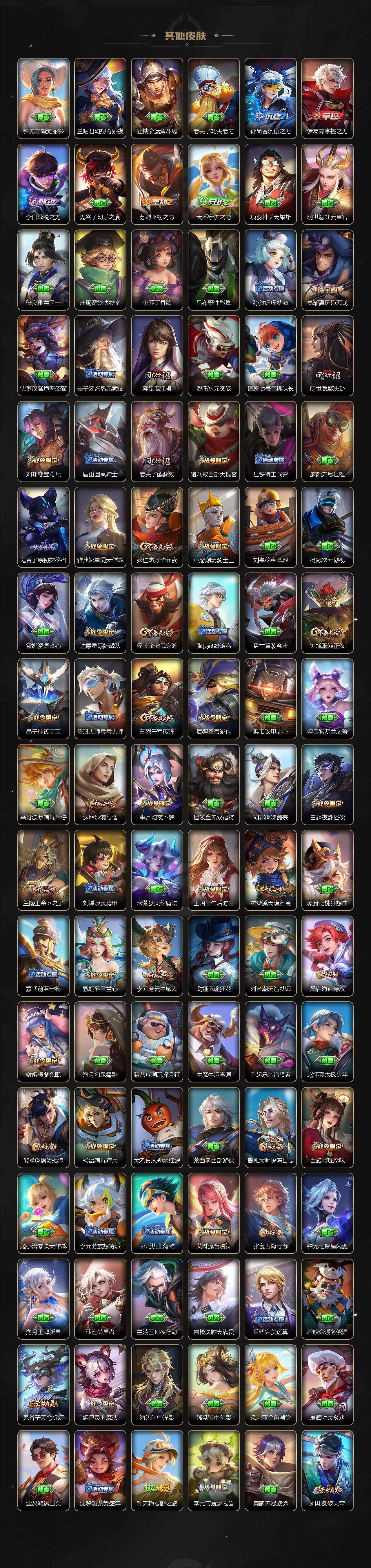 小乔青蛇,大乔白蛇,瑶遇见神鹿,娜可露露晚萤,伽罗箭羽风息,李元芳逐浪之夏,不知火舞魅语,公孙离无限星赏官,大乔猫狗日记,孙策猫狗日记,阿轲节奏热浪,露娜紫霞仙子,诸葛亮黄金分割率,王昭君偶像歌手,韩信白龙吟,项羽苍穹之光,孙尚香时之恋人,阿轲暗夜猫娘,雅典娜冰冠公主,吕布末日机甲,鲁班七号电玩小子,蒙犽龙鼓争鸣,橘右京修罗,墨子龙骑士,嬴政摇滚巨星,刘禅绅士熊喵,刘禅天才门将,白起星夜王子,安琪拉心灵骇客,安琪拉时之奇旅,程咬金功夫厨神,刘邦德古拉伯爵,兰陵王暗隐猎兽者,曹操幽灵船长,宫本武藏鬼剑武藏,司马懿暗渊魔法,亚瑟心灵战警,钟馗乐园奇幻夜,杨戬天秀·启明,蔡文姬舞动绿茵,廉颇地狱岩魂,西施诗语江南,小乔缤纷独角兽,夏侯惇乘风破浪,花木兰水晶猎龙者,铠曙光守护者,墨子金属风暴,百里玄策原初追逐者,吕布圣诞狂欢,貂蝉圣诞恋歌,百里守约特工魅影,嬴政暗夜贵公子,嫦娥拒霜思,雅典娜黎明之约,李白千年之狐,哪吒雪上飞焰,夏洛特永昼,澜赏金猎手,艾琳奇遇舞章,貂蝉唤灵魅影,高渐离天秀·音浪,张良千筹问战,庄周天秀·幻梦,弈星滕王阁序,阿古朵顽趣,杨玉环银翎春语,刘备百相守梦,关羽百相守梦,沈梦溪匿光破解者,蔡文姬电玩·兔顽号,刘禅电玩·爆裂旋风,海月浮梦罗烟,镜真我赫兹,百里守约真我赫兹,赵怀真鹤归松栖,莱西奥末日机甲,李元芳匿光侦查者,姜子牙闲日渔趣,蒙犽百解令,周瑜雪夜绮愿,高渐离燃音魔法,伽罗琥珀纪元,大乔乘龙·忆丹青,安琪拉乘龙·聚宝船,曹操夜都魔契,桑启奇遇星旅,上官婉儿群星魔术团,关羽决胜骁骑,明世隐夜落电台,海诺心动手记,李白谪仙醉月,姬小满飞车小橘子,白起苍鳞隐世,赵怀真器灵·浮梦炉,亚连糖绘人间,苍狼魂孤将,狄仁杰绮世丹青