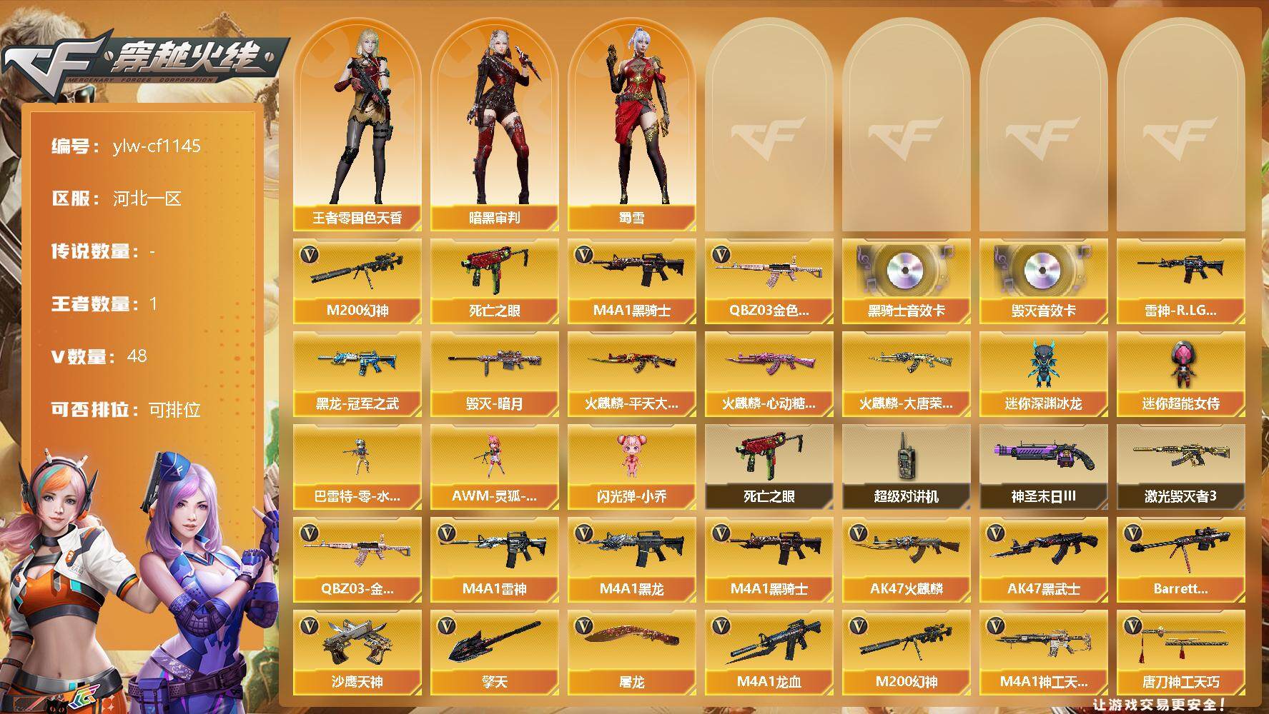 [12940910]河北一区-48V-1王者-0炫金 【热门武器】:QBZ03-金色蔷薇,M200-幻神,死亡之眼*2,M4A1-黑骑士 【音效卡】:M4A1-黑骑士音效卡,Barrett-毁灭音效卡 【稀有皮肤】:雷神-R.LGD-CFPLS18冠军,火麒麟-平天大圣*2,火麒麟-大唐荣光,火麒麟-心动糖果,黑龙-冠军之武,毁灭-暗月 【角色】:王者-零-国色天香,蜀雪,暗黑审判 【人偶武器】:巴雷特-零-水下丽影,AWM-灵狐-15周年嘉年华,迷你深渊冰龙,迷你超能女侍,闪光弹-小乔 【暴走生化】:死亡之眼*2,超级对讲机 【挑战大师】:神圣爆裂者-末日III,激光毁灭者III 【英雄级武器】:M4A1-神工天巧,唐刀-神工天巧,QBZ03-金色蔷薇,无影-神兵利器,M4A1-雷神,M4A1-黑龙*2,M4A1-黑骑士,AK47-火麒麟*2,AK47-黑武士,Barrett-毁灭,M4A1-龙血,M200-幻神,VSK-94-金蚀,黑武士-锦绣游龙,AK-47-猩红传说*8,AK47-B-战神*2,沙鹰-天神*3,擎天,屠龙*2,擎天-云海游龙