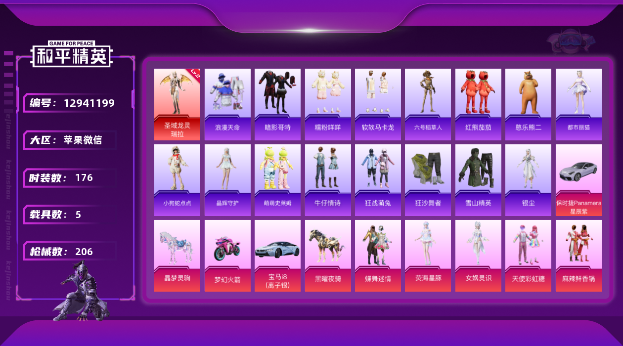 [12941199]AK779-有二次-苹果-1红装-23粉装-16特效枪-5载具-13粉色飞行器-94210热力值-5王牌印记-176套装-206枪皮 【红色神装等级】:圣域龙灵-瑞拉(二级) 【热门品类】:粉装-梦幻火箭,粉装-缤纷油彩,套装-浪漫天命,套装-深海小丑鱼,套装-奇异狩猎者,套装-动感兔斯基人偶服,套装-潮萌小黄鸭,套装-暗影哥特,套装-糯粉咩咩,套装-软软马卡龙,角色-六号稻草人,套装-红熊茄茄 【粉色载具】:宝马i8(离子银),保时捷Panamera(星辰紫),双人摩托-梦幻火箭,晶梦灵驹,黑曜夜骑 【粉色套装】:粉装-甜心巧克力,粉装-宝贝奶油派,粉装-天使彩虹糖,粉装-火曜朱雀,粉装-土曜战麒,粉装-金曜白虎,粉装-蝶舞迷情,粉装-精灵迷巫,粉装-梦幻火箭,粉装-华贵君王,粉装-天启纪元,粉装-星之信仰,粉装-麻辣鲜香锅,粉装-缤纷油彩,粉装-放客神游,粉装-牡丹亭·游园,角色-女娲灵识,角色-晶梦幻蝶,角色-月下星之子,粉装-雪月幻音,粉装-幻彩电音,角色-荧海星豚,角色-奇迹舞步 美琪 【粉色枪皮等级】:AKM-甜心宝贝(五级),SCAR-L-梦幻火箭(六级),M416-五爪金龙(七级),M416-女娲灵识(三级),GROZA-镜光银凌(五级),AUG-星梦奇缘(三级),AUG-暖羊咩咩(五级),M762-甜蜜誓约(四级),蜜獾-荧海星豚(四级),Kar98K-巳巳如意(五级),Kar98K-圣域龙灵(三级),M24-星之信仰(五级),Mini14-龙虾霸霸(四级),DP-28-豹影疾电(五级),破片手榴弹-瓶中星球(五级) 【粉色枪皮】:AKM-甜心宝贝,SCAR-L-梦幻火箭,M416-五爪金龙,M416-女娲灵识,GROZA-镜光银凌,AUG-星梦奇缘,AUG-暖羊咩咩,M762-甜蜜誓约,蜜獾-荧海星豚,Kar98K-巳巳如意,Kar98K-圣域龙灵,M24-星之信仰,Mini14-龙虾霸霸,DP-28-豹影疾电,烟雾弹-猫咪绅士,破片手榴弹-瓶中星球 【粉色飞行器】:酣梦熊熊飞行器,春暖花开飞行器,精灵迷巫飞行器,梦幻火箭飞行器,凤舞九天飞行器,万象金身飞行器,月下星之子飞行器,戏水时光飞行器,圣域金龙飞行器,雀灵庇佑飞行器,飞天猪飞行器 【粉色降落伞】:百万伏特降落伞,甜心宝贝降落伞,至尊龙雀降落伞,春暖花开降落伞,精灵迷巫降落伞,梦幻火箭降