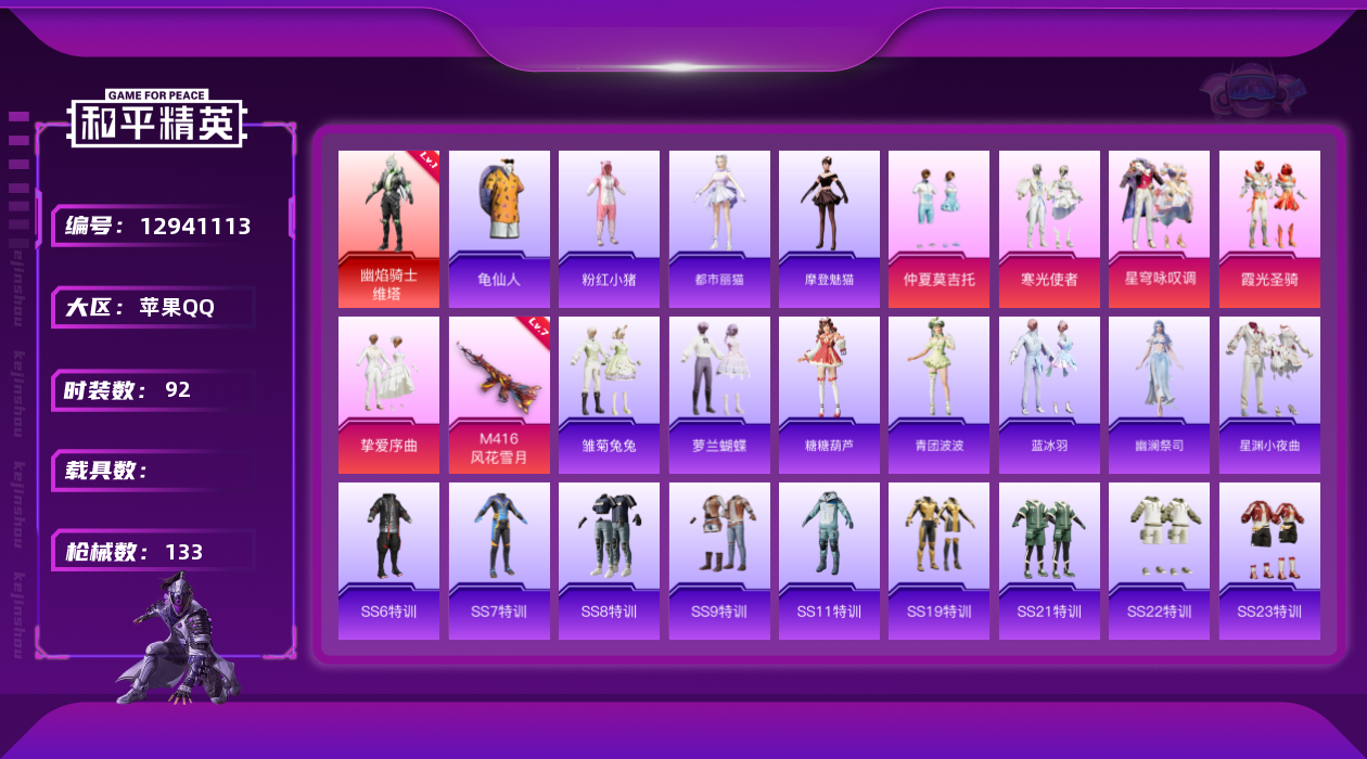 [12941113]苹果 手Q-1神装-5粉装-1特效枪-0载具-4粉色飞行器-43281热力值-6王牌印记-92套装-133枪皮
