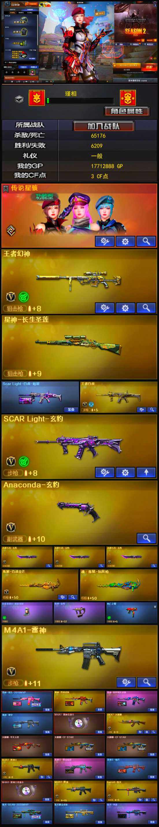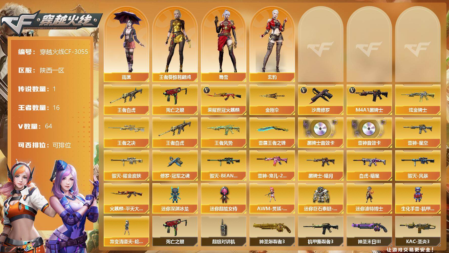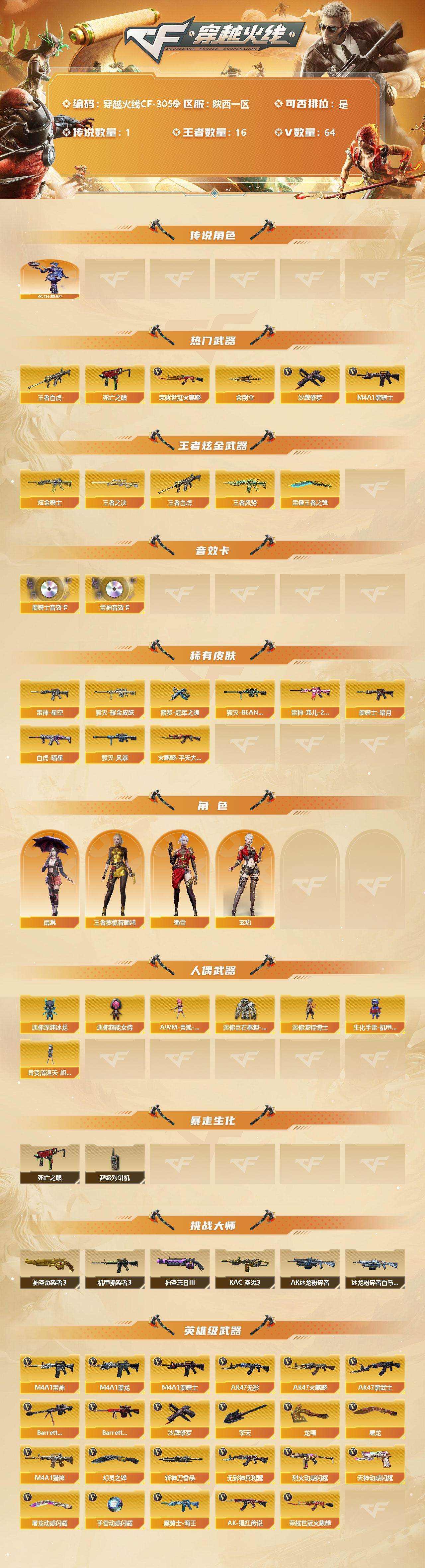 [12940911]陕西一区-64V-16王者-1炫金 【传说角色】:传说星骇 【热门武器】:王者白虎,死亡之眼,荣耀世冠-火麒麟,M4A1-黑骑士,沙鹰-修罗*2,金刚伞 【王者炫金武器】:王者白虎,王者风势,王者之决,雷霆王者之锋,炫金骑士 【音效卡】:M4A1-雷神音效卡,M4A1-黑骑士音效卡 【稀有皮肤】:Scar Light-白虎-暗星,雷神-星空,雷神-宠儿-2019MVP,火麒麟-平天大圣,黑骑士-暗月,毁灭耀金皮肤,毁灭-BEAN-2020MVP,毁灭-风暴,修罗-冠军之魂 【角色】:雨棠,玄豹,王者葵-惊若翩鸿,蜀雪 【人偶武器】:AWM-灵狐-15周年嘉年华,异变清道夫-蛇影双骄,迷你深渊冰龙,迷你超能女侍,迷你巨石泰坦-魔花研究所,迷你波特博士,生化手雷-机甲核心*2 【暴走生化】:死亡之眼,超级对讲机 【挑战大师】:神圣爆裂者III,机甲撕裂者III,神圣爆裂者-末日III,KAC-圣炎切割者III,AK47-冰龙粉碎者,冰龙粉碎者-白马银枪 【英雄级武器】:AK47-火麒麟,M4A1-黑龙,M4A1-雷神,M4A1-黑骑士,AK47-无影,AK47-黑武士,无影-神兵利器,SCAR Light-玄豹,M4A1-猎神,烈火-动感闪耀,AK-47-猩红传说,黑骑士-海王*2,荣耀世冠-火麒麟,Barrett-毁灭,Barrett-极光,沙鹰-修罗*2,天神-动感闪耀,屠龙,龙啸,擎天,幻灵之锋,屠龙-动感闪耀,斩神刀-雷暴,手雷-动感闪耀 【特殊枪械】:1黑骑士