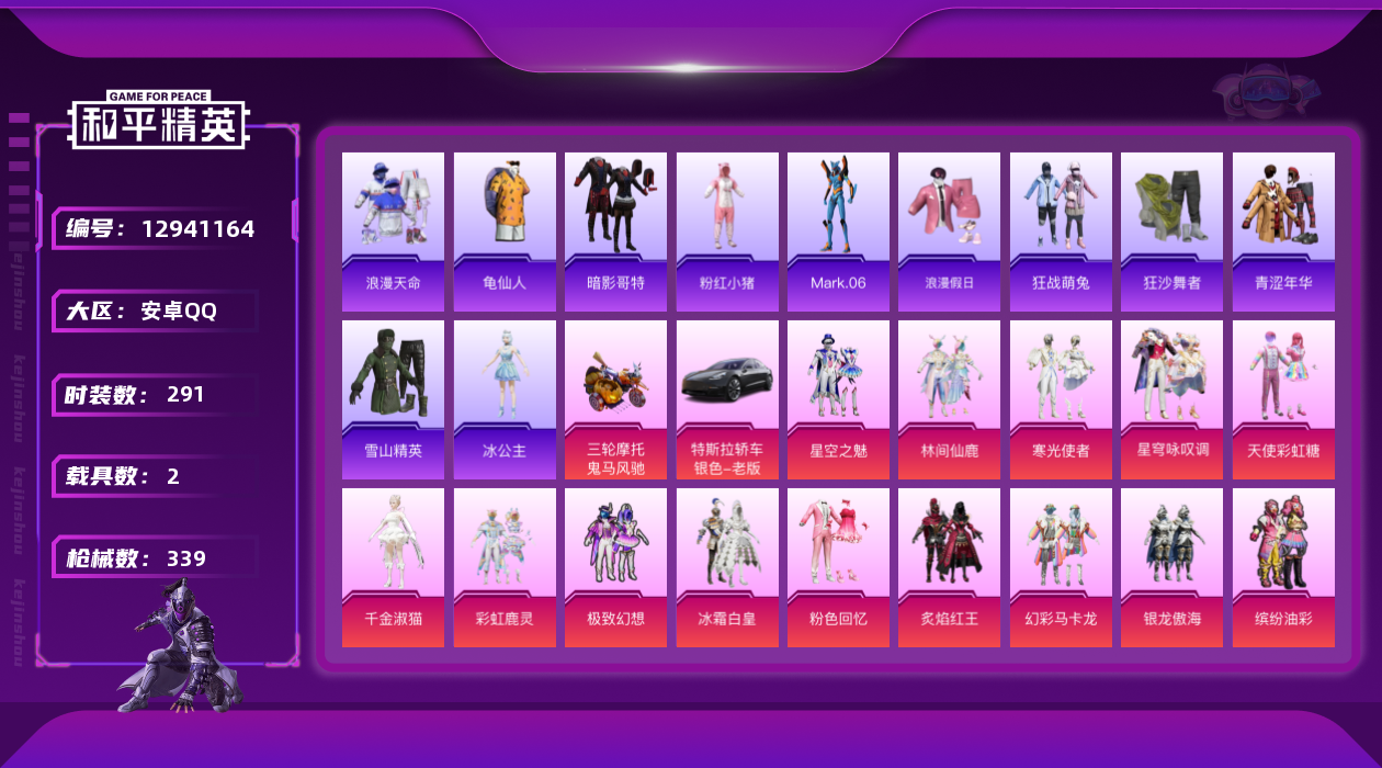 [12941164]MQ670安卓 手Q-18粉装-8特效枪-2载具-2粉色飞行器-121164热力值-16王牌印记-291套装-339枪皮
