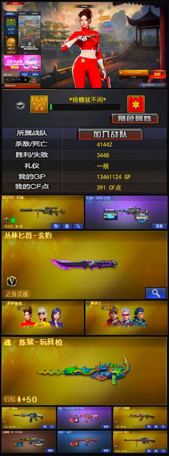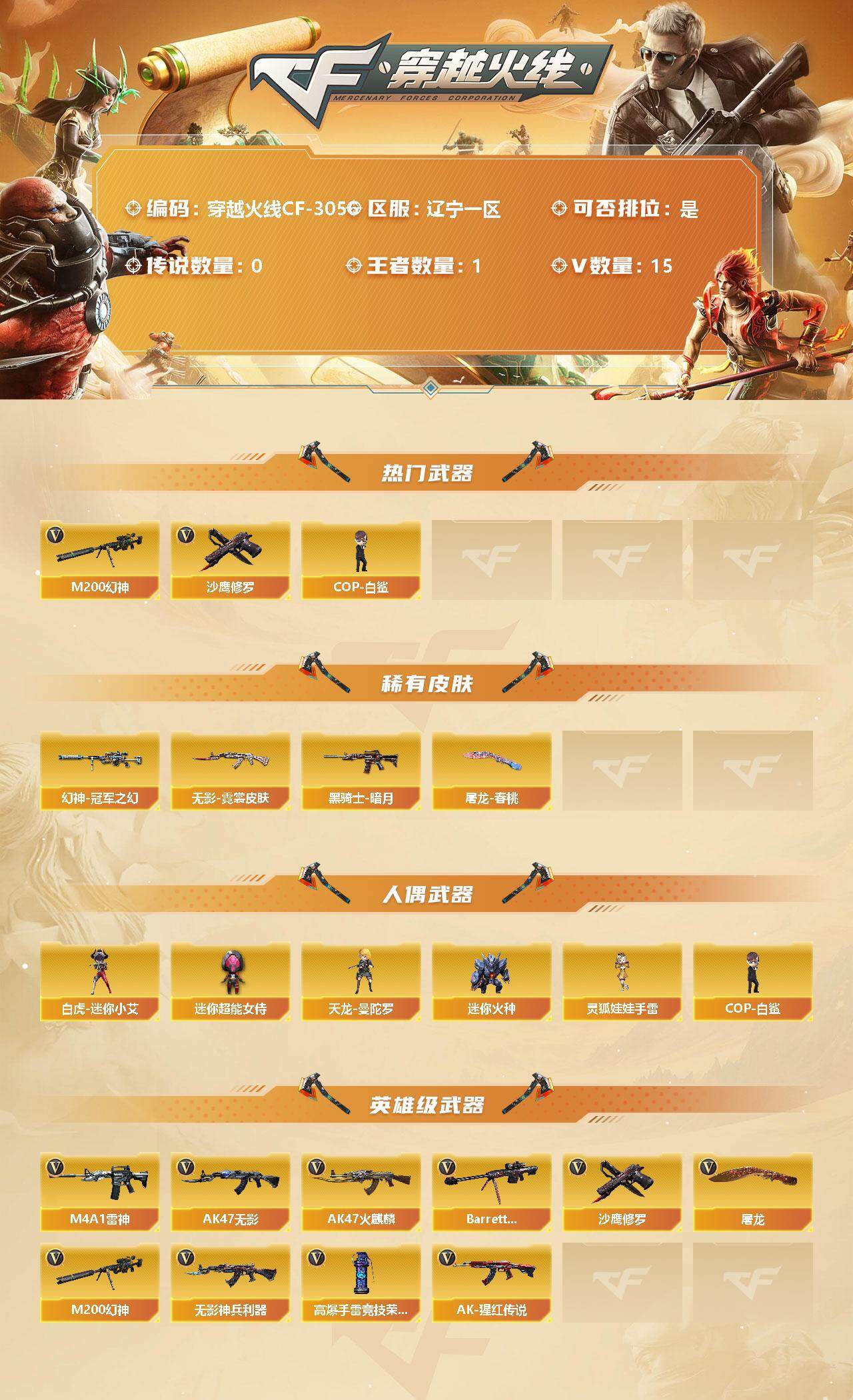 [12941309]辽宁一区-15V-1王者-0炫金 【热门武器】:M200-幻神,COP-白鲨,沙鹰-修罗 【稀有皮肤】:幻神-冠军之幻,黑骑士-暗月,无影-霓裳皮肤,屠龙-春桃 皮肤 【人偶武器】:COP-白鲨,白虎-迷你小艾,天龙-曼陀罗,迷你超能女侍,迷你火种*2,灵狐娃娃手雷 【英雄级武器】:AK47-火麒麟,M4A1-雷神,AK47-无影,无影-神兵利器,AK-47-猩红传说,Barrett-毁灭,M200-幻神,沙鹰-修罗,屠龙,高爆手雷-竞技荣光 【特殊枪械】: