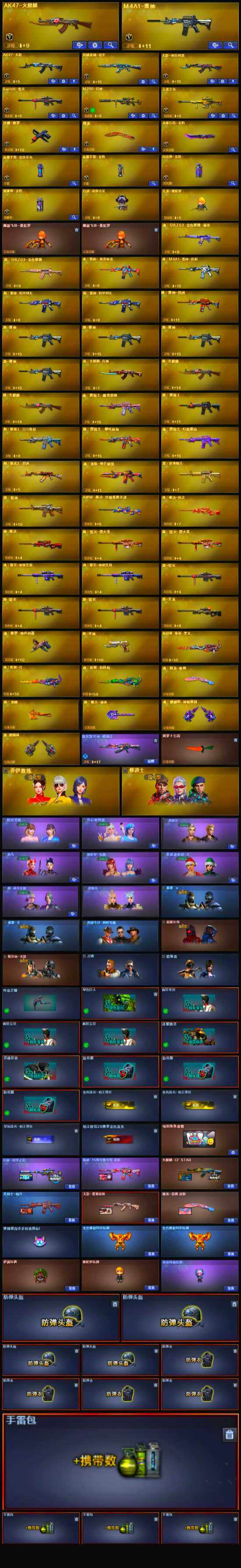 【英雄级武器】:AK47-火麒麟,M4A1-雷神,AK47-无影,无影-神兵利器,AK-47-猩红传说,Barrett-毁灭,M200-幻神,沙鹰-修罗,屠龙,高爆手雷-竞技荣光