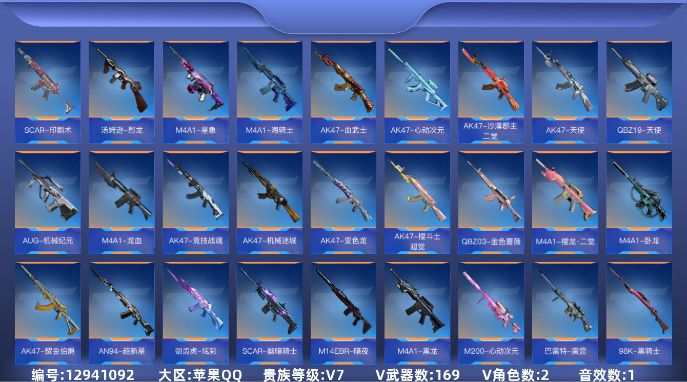【v武器】 09式狙-魔音长歌 98K-星神 98K-黑骑士 AK47-沙漠郡主-二觉 AK47-心动次元 AK47-冰魂 AK47-耀金伯爵 AN94-超新星 AK47-樱斗士-超觉 AK47-变色龙 AK47-血武士 AK47-机械迷城 AK47-竞技战魂 AUG-机械纪元 AK47-天使 AWM-裁决 暗杀神 巴雷特-变色龙 巴雷特-雷霆 巴雷特-枪娘 CZS2-血月 地狱火 地狱火 地狱烈炎 改装GLOCK-黑龙 黑龙刺 寒霜烈龙 加特林-堡垒 加特林-堡垒 激光短刃-黑骑士 剑齿虎-炫彩 KSG-火力竞放 刘易斯-血月 M200-心动次元 M14EBR-暗夜 M4A1-卧龙 M4A1-樱龙·二觉 墨刃-幻神 M4A1-猎神 蟒蛇-火力竞放 M4A1-星象 M4A1-黑龙 M4A1-游骑兵 M4A1-海骑士 M4A1-龙血 MK5-极光 M12S-雷霆 MG3-雏凤 尼泊尔-机械纪元 PP19野牛-造纸术觉醒 麒麟刺 QBZ03-金色蔷薇 擎天觉醒 秋逸觉醒 QSZ92-华夏传说 QBB95-极光 QCW05-变形金刚·大黄蜂 QCW05-变形金刚·大黄蜂 QBZ19-天使 QSZ92-天使 神罚战斧 SCAR-幽暗骑士 沙鹰-飞电 双持尼泊尔-变色龙 双截棍-天使 SCAR-探星者 SCAR-印刷术 SCAR-印刷术 嗜血金鲨 双持斯泰尔-天使 双管猎枪-黑骑士 双持沙鹰-变色龙 铁锹-孟德 汤姆逊-烈龙 USP-神罚 星芒 血阳 消音沙鹰-牛魔王 斩魔剑-天使 左轮-黑武士觉醒 战斧-无影 斩神刀
