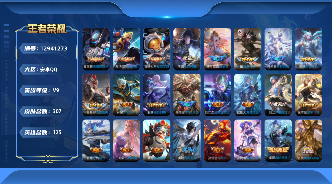 [12941273]MQ627-安卓Q-V5-最强王者段位-125英雄-307皮肤-3典藏-0珍品无双-0无双-0珍品传说-22传说-93史诗