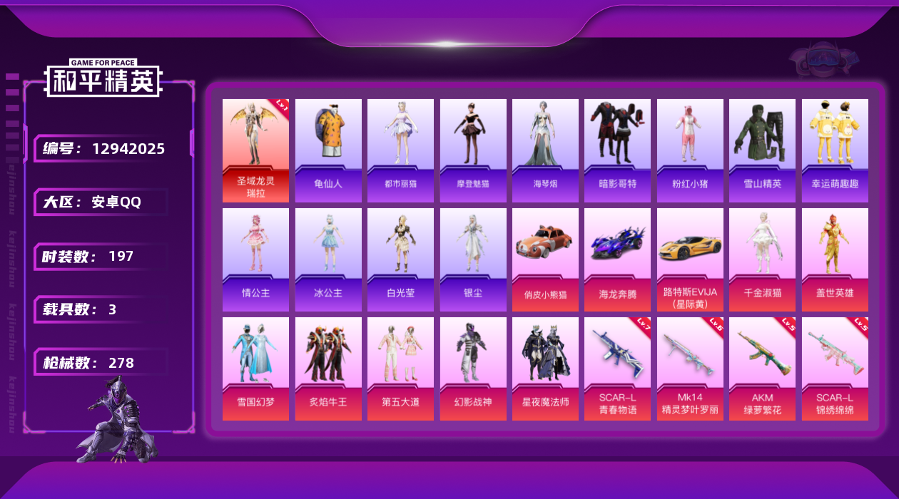 - [11578520]3粉装 6特效枪 12印记 可二次 可修改实名 身法装备:舞王派对(派对舞王、小金鞋),8号机(新粉螳螂) 优质装备:舞王派对(派对舞王、小金鞋),M416心之恋语,洛天依,AKM绿萝繁花,SCAR-L-锦绣绵绵,七级M416-心之恋语,UMP45量子极限,Kar98K-巳巳如意 热门装扮:炫光之旅,金丰海韵,梦魇先生,派对舞王(小金鞋) 稀有枪皮:DP-28-豹影疾电 五级特效枪:五级UMP45-量子极限,五级Kar98K-巳巳如意,五级DP-28-豹影疾电,五级SCAR-L-锦绣绵绵,五级AKM-绿萝繁花 紫色装扮:田园牧歌,轻风白浪,和煦暖阳,SS22特训,SS23特训,幻彩翩翩,妙红点点,娇憨猪猪,萌趣咩咩,SS21特训,绚烂繁星,SS31特训套装,六六大吉,冰川特警,霓虹热舞,旭日情侣,SS30特训套装,SS33特训套装,青涩时光,顶瓜瓜,SS20特训,SS16特训,萌趣颜团子,特种颜团子,猎梦纪元,飞驰魅影,音速流光,SS19特训,竞技角斗士,覆海蛟龙,甜心亚梦,虚音幻奏,瑞龙福将,团圆交子,SS17特训,冰川谧蓝,异彩先驱,SS18特训,都市漫游者,酒红色名流,野性战心,长空猛禽,霓虹极客,霓虹街区,缤纷果语,蓝色运动,虎虎生威吉莉,无面战甲,飞行日记,龙腾端午,骑行爱好者,鹤鸣,黄色名流,黄色运动,黎明保卫者,黑色伏地魔,龙的传人,龟仙人,冰河战士,龙魂突击队,蝶变,香桃花海,柠萌假日,沙漠兵团,活力之心,海岛探路者,滨海假日,幻影武者,幻世战舞者,探宝勇士,湖蓝色名流,滨海厨神,破晓战魂,甜蜜告白,福星高照,空岛之星,空投萌叽,红色运动,王牌教练,灰色格斗者,炫蓝之夏,热血青春,小熊娃娃,雏菊兔兔,萝兰蝴蝶,SS29特训,先驱飞行员,星途旅人,创世·幻影,纯真浪花,热情海星,曼妙人鱼,SS28特训,8号机(新粉螳螂),异域银装,鱼渊荷华,玉兔迎春,燕燕于飞,巳巳如意,风玲,青团波波,糖糖葫芦,棉花软糖,竞技名士,街头风暴,银尘,惊鸿侠骨,SS24特训(SS24特训套装),SS25特训,绝对偶像,金戈铁马,锦衣飞扬,粉红小猪,焰鹰斗篷,幻羽潜行,幽夜迷踪,SS27特训,明鸳圣池,日照花林,SS26特训,春光漫游,快闪甜心,贝斯之夜,智谋强哥,大橘大利,耀粉歌者,春日漫步,粉恋花,蓝冰羽,紫幽梦,SS32特训服(SS32特训套装),瑰梦爱神,绯格组合