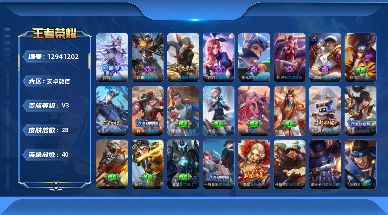 [12941202]【微信社交限制 建议勿拍!】AK097小国标阿轲 安卓WX-V3-最强王者段位-40英雄-28皮肤-0典藏-0珍品无双-0无双-0珍品传说-0传说-7史诗
