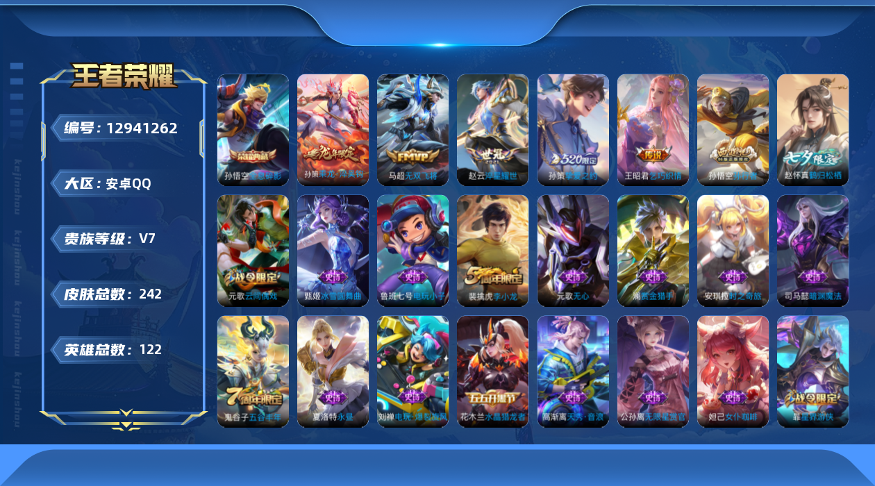 [12941262]【暑期末清货/特价急出/永久包赔/商品详情看图】:安卓Q-V7-至尊星耀V段位-122英雄-242皮肤-1典藏-5传说-64史诗