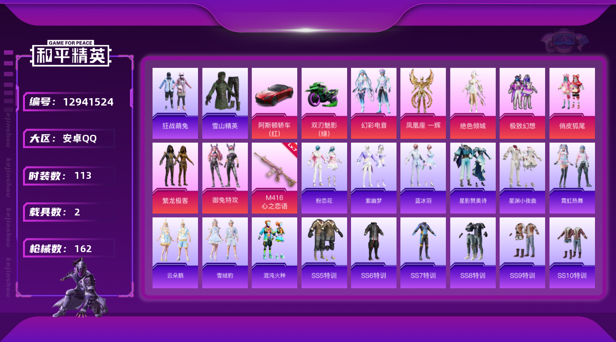 [12941524]安卓 手Q-7粉装-2特效枪-2载具-5粉色飞行器-51180热力值-2王牌印记-113套装-162枪皮 【热门品类】:粉装-繁龙极客,套装-潮萌小黄鸭,小恶魔头饰 【粉色载具】:阿斯顿马丁DBS(红),双人摩托-双刃魅影(绿) 【粉色套装】:粉装-极致幻想,粉装-俏皮狐尾,粉装-繁龙极客,角色-绝色倾城,角色-凤凰座 一辉,粉装-御兔特攻,粉装-幻彩电音 【粉色枪皮等级】:M416-心之恋语(七级),Mk14-甜梦熊击(五级) 【粉色枪皮】:M416-心之恋语,Mk14-甜梦熊击 【粉色飞行器】:潮汐统领飞行器,镜光幻境飞行翼,繁龙极客飞行器,绝色倾城飞行器 【粉色降落伞】:四圣焕新降落伞,马卡龙降落伞,银刃赛罗降落伞,智耀战神降落伞,绯果甜心降落伞,星穹咏叹调降落伞,幻星舰长降落伞,幻彩电音降落伞,时光之吻降落伞 【稀有套装】:套装-粉恋花,套装-紫幽梦,套装-蓝冰羽,套装-星影赞美诗,套装-星渊小夜曲,套装-霓虹热舞,套装-云朵鹅,套装-雪绒豹,套装-混沌火种 【稀有枪皮】:AKM-四圣焕新,AKM-夜灯,AKM-灼热熔岩,AKM-玉龙,AKM-生命誓言,AKM-破晓战魂,AKM-霓虹街区,AKM-龙的传人,M16A4-夜灯,M16A4-机械英豪,M16A4-红色方程式,M16A4-百变魔方,SCAR-L-炫彩节奏,SCAR-L-玉兔迎春,SCAR-L-玫瑰恋情,SCAR-L-红色方程式,SCAR-L-雷霆特警,SCAR-L-黄金龙骨,M416-夜灯,M416-红色方程式,M416-绯红前夜,M416-罗小黑,M416-蓝色火焰,GROZA-治愈之星,GROZA-黑色刀锋,QBZ-原初圣火,QBZ-彩虹符号,QBZ-神秘黑猫,QBZ-诡娃娃,QBZ-赛罗,M762-彩虹符号,M762-拳皇97,M762-牛气冲天,M762-诡娃娃,M762-镭射皇者,M762-云朵鹅,G36C-不夜海上花,G36C-星穹咏叹调,蜜獾-天降萌叽,UZI-众神之王,UZI-天降萌叽,UZI-红色方程式,UMP45-天启纪元,UMP45-生命誓言,Vector-治愈之星,Vector-黑色刀锋,汤姆逊-勇闯险境,汤姆逊-天降萌叽,野牛-扶摇飞仙,野牛-机械英豪,MP5K-众神之王,MP5K-甜蜜誓约,Kar98K-勇闯险境,Kar98K-彩虹符号,Kar98K-王子的夏天,Kar
