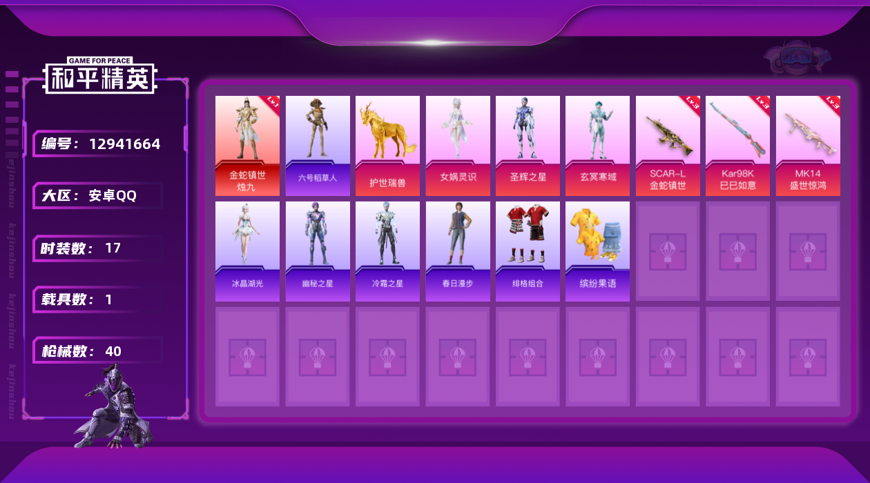 [12941664]暑期末清货/特价急出/永久包赔/商品详情看图 精品连体/满蛇年/无双曜/典藏凯 3珍品传说安卓 手Q-1红装-3粉装-3特效枪-1载具-1.3w热力值-1印记-17套装-40枪皮【角色神装等级】:金蛇镇世-烛九(一级金蛇镇世-烛九)【稀有载具】:护世瑞兽【特效枪等级】:SCAR-L-金蛇镇世(三级SCAR-L-金蛇镇世),Kar98K-巳巳如意(三级Kar98K-巳巳如意),Mk14-盛世惊鸿(三级Mk14-盛世惊鸿)【优质套装】:角色-女娲灵识,角色-玄冥寒域,角色-圣辉之星【稀有套装】:角色-冰晶湖光,角色-幽秘之星,角色-冷霜之星,角色-六号稻草人【优质武器皮肤】:SCAR-L-金蛇镇世,Kar98K-巳巳如意,Mk14-盛世惊鸿【优质飞行器】:凤舞九天飞行器,万象金身飞行器
