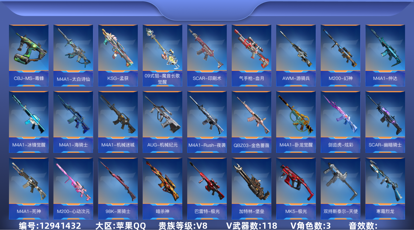 [12941432]暑期末清货/特价急出/永久包赔/商品详情看图 有二次/VIP8级/多王者套/多三国武器3英雄角色数-115英雄武器数 【王者系列】:王者之影,王者之心,王者之锋 【热门武器】:KSG-孟获,M4A1-仲达,M200-幻神,AWM-游骑兵 【英雄武器】:M4A1-仲达,M4A1-猎神,M4A1-卧龙觉醒,M4A1-Rush-夜袭,M4A1-死神,M4A1-机械迷城,M4A1-海骑士,M4A1-冰锋觉醒,M4A1-太白诗仙,SCAR-幽暗骑士,SCAR-幽暗骑士,SCAR-探星者,SCAR-印刷术,AUG-机械纪元,QBZ03-金色蔷薇,剑齿虎-炫彩,AWM-游骑兵,巴雷特-极光,暗杀神,M200-心动次元,M200-幻神,09式狙-魔音长歌觉醒,98K-黑骑士,加特林-堡垒,QBB95-极光,MK5-极光,寒霜烈龙,双持斯泰尔-天使,双持斯泰尔-天使,CBJ-MS-毒蜂,地狱烈炎,KSG-火力竞放,KSG-孟获,沙鹰-冰锋觉醒,沙鹰-修罗,沙鹰-幻兽,沙鹰-无影,QSZ92-华夏传说,CZ75-穷奇,气手枪-血月,丛林匕首-火力竞放,雌雄双股剑,麒麟刺,擎天觉醒,秋逸,星芒,星芒,血阳,血月 【其他武器】:玫瑰精灵,寒霜烈龙 【角色】:审判者,樱,关小雨