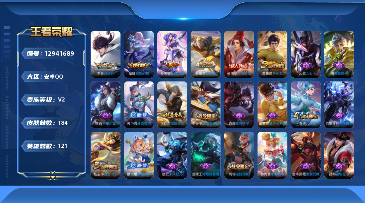 - PX_2106949-实名: 可修改 贵族等级: V6 英雄数: 111 皮肤数: 122 传说皮: 黄金狮子座,游龙清影,澜逐花归海 限定皮: 大圣娶亲,孙行者,山海·玄木吟,鸣野蒿,愿照·九州拓