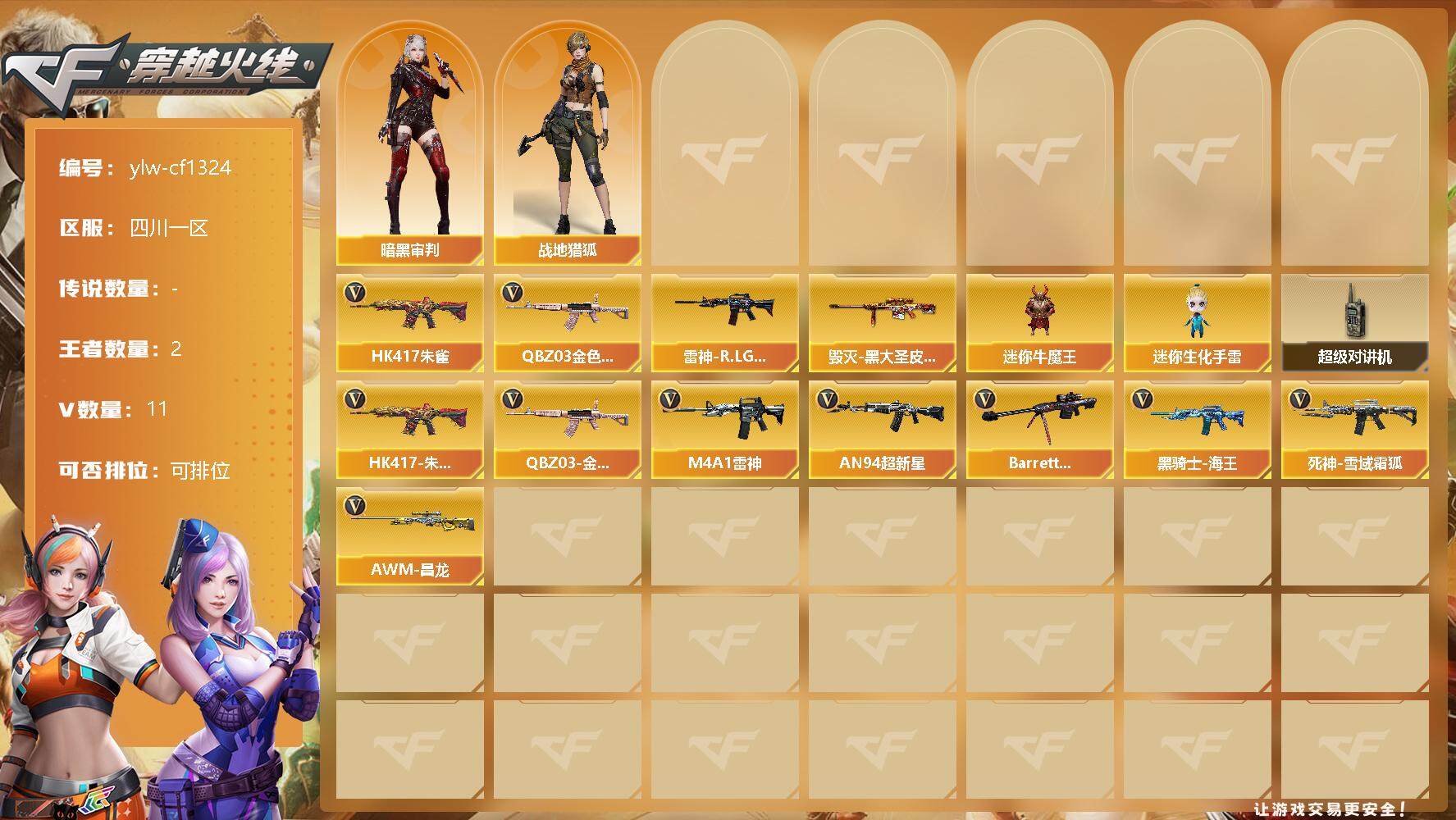 [12941176]四川一区-11V-2王者-0炫金 【热门武器】:QBZ03-金色蔷薇,HK417-朱雀 【稀有皮肤】:雷神-R.LGD-CFPLS18冠军,毁灭-黑大圣皮肤 【角色】:暗黑审判,战地猎狐 【人偶武器】:迷你牛魔王,迷你生化手雷 【暴走生化】:超级对讲机 【英雄级武器】:QBZ03-金色蔷薇,HK417-朱雀,M4A1-雷神,AN94-超新星,Barrett-毁灭,黑骑士-海王*2,死神-雪域霜狐,AWM-昌龙 【特殊枪械】:
