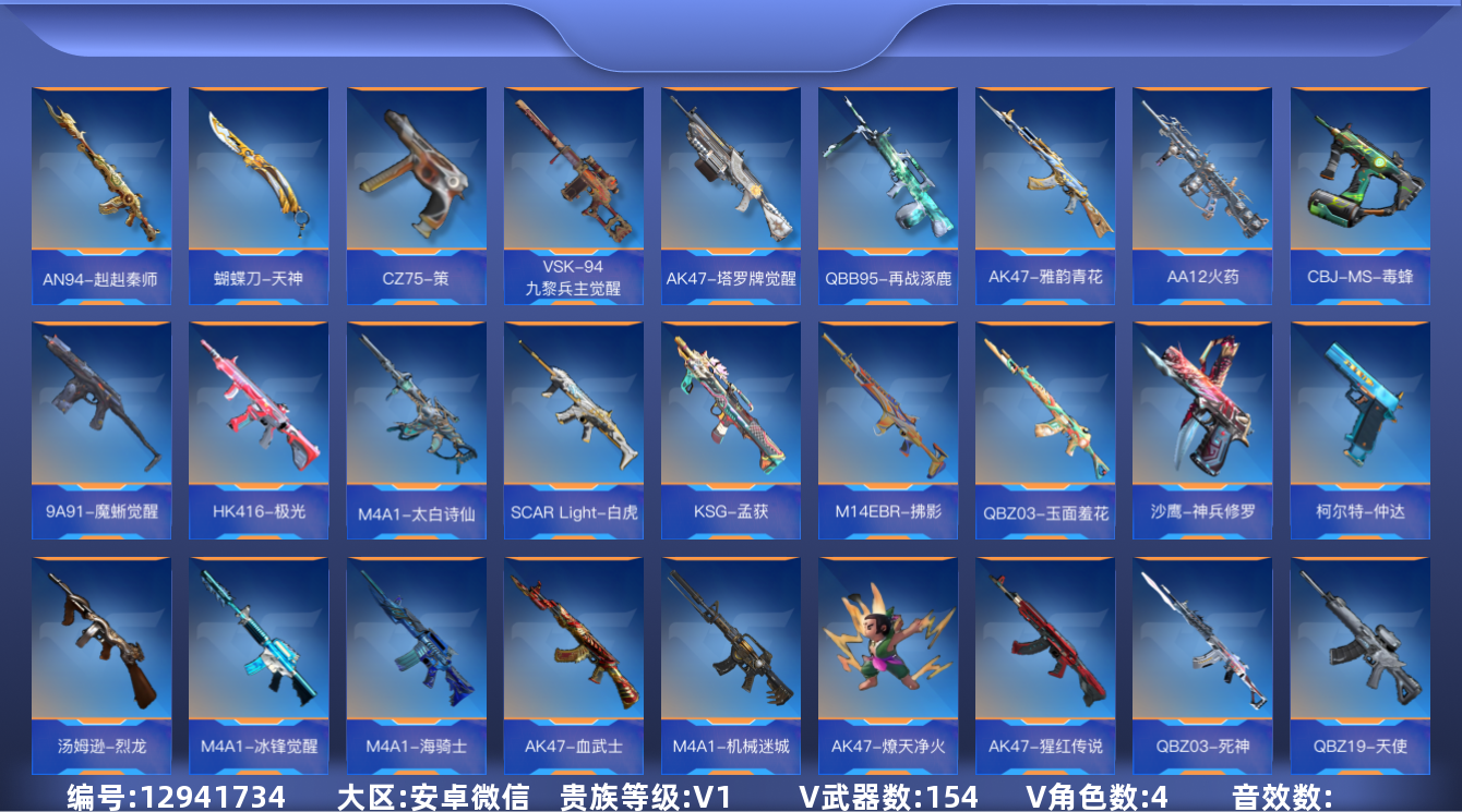 [12941734]AK3654英雄角色数-150英雄武器数 【王者系列】:王者之蝶,王者之狱 【热门武器】:KSG-孟获,81式-阿波罗,CZS2-仲康 【角色】:审判者,葵,炽天使-X,零-新生 【英雄武器】:AK47-火麒麟*2,AK47-猩红传说,AK47-燎天净火,AK47-血武士,AK47-黑鲨,AK47-木兰,AK47-雅韵青花,AK47-塔罗牌觉醒,AK47-谜城烟火,M4A1-雷神,M4A1-死神*2,M4A1-龙血,M4A1-机械迷城,M4A1-海骑士,M4A1-冰锋觉醒,M4A1-猎神,M4A1-太白诗仙,SCAR Light-白虎,SCAR-探星者,SCAR-心动PICK,AN94-赳赳秦师,AUG-机械纪元,9A91-魔蜥觉醒*2,M14EBR-拂影,M14EBR-葫芦山庄,QBZ03-金色蔷薇,QBZ03-死神*2,QBZ03-玉面羞花,HK416-极光,QBZ19-天使,QBZ97-浩瀚征途,QBZ191-封神榜,AWM-裁决,AWM-天使,AWM-指南针觉醒,巴雷特-毁灭*3,巴雷特-极光*2,巴雷特-朱雀,M200-心动次元觉醒,09式狙-天神,98K-黑骑士,98K-星神,MR1-幽暗骑士,VSK-94-九黎兵主觉醒,加特林-堡垒*3,加特林-蟒蛇*2,QBB95-极光,QBB95-再战涿鹿,汤姆逊-烈龙*3,双持斯泰尔-天使,CBJ-MS-毒蜂*2,CZS2-仲康,DDM4-PDW-星际宇航觉醒,地狱火,嗜血金鲨,地狱烈炎,AA12-火药,KSG-孟获,Origin12-机变奇蛇觉醒,USP-神罚,USP-机械迷城,USP-仁德,沙鹰-修罗*4,沙鹰-神兵修罗,沙鹰-宇航兔兔,双持沙鹰-元让,蚩尤战弓觉醒,改装GLOCK-木兰,蟒蛇-鼓龙,左轮-卧龙觉醒,双持GLOCK18-本初,GLOCK18-猎神,QSZ92-天使,柯尔特-仲达,CZ75-策,掠夺者P365-虹舞,蝴蝶刀-天神,炽芒蝶刃,匕首-浩瀚征途,血阳,手斧-机械迷城*2,气勇胆烈戟,屠龙*4,血月,穷奇铁扇,唐刀-大唐荣耀,擎天
