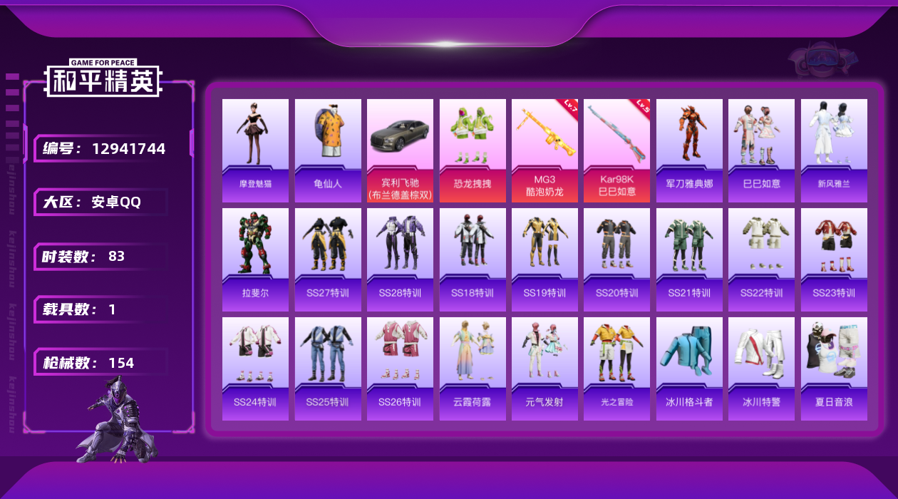 [12941744]【暑期末清货/特价急出/永久包赔】:安卓 手Q-2粉装-2特效枪-1载具-4.3w热力值-3印记-83套装-154枪皮【稀有载具】:宾利飞驰(布罗德盖棕双色)【特效枪等级】:Kar98K-巳巳如意(五级Kar98K-巳巳如意),MG3-酷泡奶龙(七级MG3-酷泡奶龙)【优质套装】:粉装-恐龙拽拽【稀有套装】:角色-摩登魅猫,套装-巳巳如意,套装-新风雅兰【优质武器皮肤】:Kar98K-巳巳如意,AWM-黄金龙骨,MG3-酷泡奶龙【热门品类】:角色-军刀雅典娜