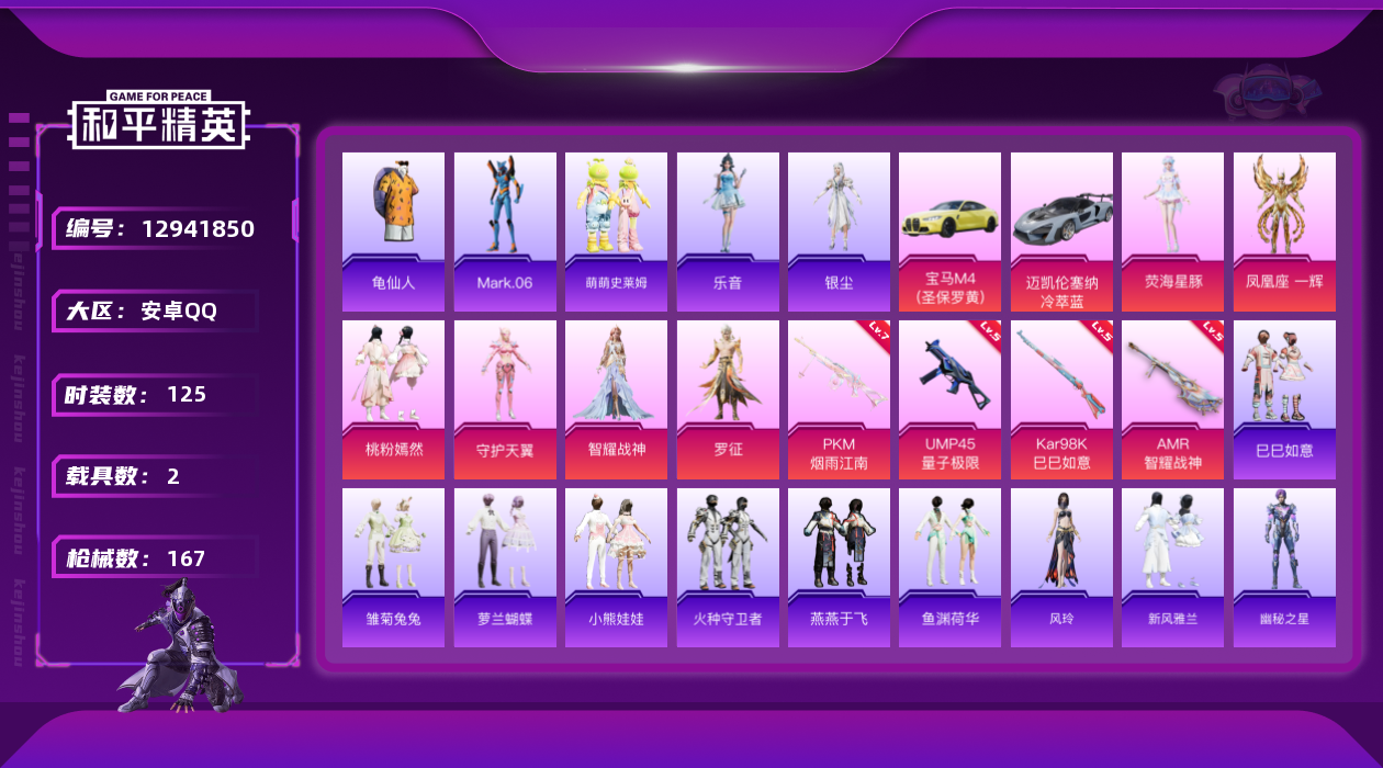 [12941850]MQ774-安卓 手Q-6粉装-5特效枪-2载具-6粉色飞行器-53054热力值-8王牌印记-125套装-167枪皮