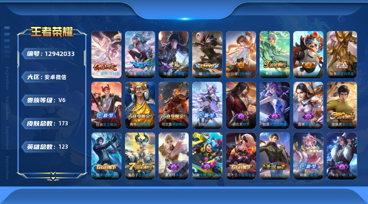 [12942033]AK597-安卓WX-V6-永恒钻石II段位-123英雄-173皮肤-1典藏(水晶未兑换)-0珍品无双-0无双-0珍品传说-8传说-45史诗