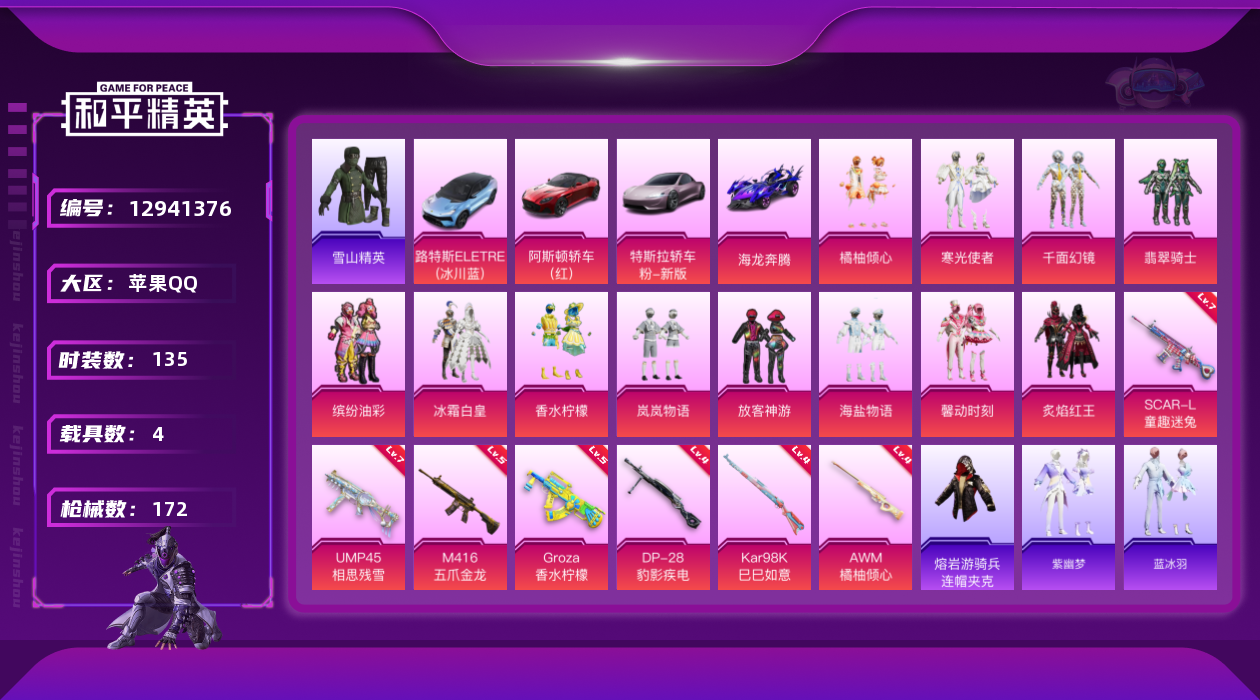 [12941376]MQ678 苹果 冥河战士木乃伊!手Q-12粉装-7特效枪-4载具-3粉色飞行器-65521热力值-9王牌印记-135套装-172枪皮