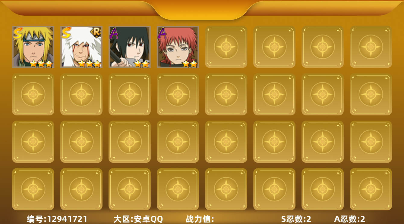 [12941721]2S级忍者数-2A级忍者数 【S级忍者】:自来也「舞之豪杰」(3星自来也「舞之豪杰」),波风水门(3星波风水门) 【A级忍者】:蝎(2星蝎),宇智波佐助「须佐能乎」(2星宇智波佐助「须佐能乎」)