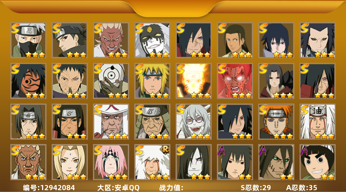 [12942084]29S级忍者数-35A级忍者数 【S级忍者】:三代目风影「秽土转生」(3星),猿飞日斩「秽土转生」(3星),千手柱间「秽土转生」(3星),宇智波鼬「秽土转生」(3星),宇智波斑「秽土转生」(3星),宇智波斑「秽土转生·解」(3星),春野樱「忍界大战」(3星),宇智波带土「忍界大战」(3星),艾「忍界大战」(3星),宇智波鼬「须佐能乎」(3星),宇智波止水「须佐能乎」(3星),旗木卡卡西「须佐能乎」(3星),宇智波斑「木叶创立」(3星),千手柱间「木叶创立」(3星),艾「四代目雷影」(3星),自来也(3星),自来也「舞之豪杰」(3星),大蛇丸(3星),纲手(3星),猿飞日斩(3星),波风水门(3星),药师兜「仙人模式」(3星),神秘面具男「红夜之刃」(3星),漩涡鸣人「九喇嘛连结」(3星),迈特凯「死门」(3星),佩恩「天道」(3星),宇智波佐助「永恒万花筒」(3星),宇智波斑 「白面具」(3星宇智波斑「白面具」),大筒木桃式(3星) 【A级忍者】:艾「青年」(2星),长门「青年」(2星),波风水门「青年」(2星),达鲁伊「博人传」(2星),迪达拉(2星),迪达拉「秽土转生」(2星),大蛇丸「晓」(2星),奇拉比(2星),奇拉比「忍界大战」(2星),飞段(2星),飞段「死司凭血」(2星),干柿鬼鲛(2星),漩涡博人「桃式显现」(2星),漩涡鸣人「九尾查克拉」(2星),迈特凯(2星),我爱罗「疾风传」(2星),我爱罗「忍界大战」(2星),蝎(2星),小南(2星),角都「秽土转生」(2星),猿飞阿斯玛(2星),宇智波止水(2星),宇智波鼬(2星),宇智波佐助「须佐能乎」(2星),宇智波佐助「万花筒写轮眼」(2星),照美冥「五代目水影」(2星),日向宁次「忍界大战」(2星),日向雏田「最终章」(2星),长十郎「六代目水影」(2星),李洛克「忍界大战」(2星),黑土「博人传」(2星),秋道丁次「忍界大战」(2星),千代「近松十人卫」(2星),不风(2星),宇智波泉奈(2星)