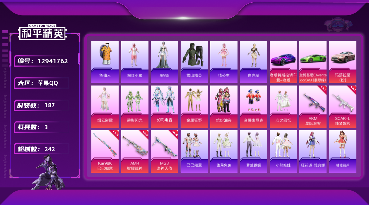 [12941762]MQ748-苹果-手Q-7粉装-5特效枪-3载具-1粉色飞行器-80037热力值-15王牌印记-187套装-242枪皮 【热门品类】:粉装-音爆索尼克,粉装-缤纷油彩,套装-龟仙人,套装-粉红小猪,小恶魔头饰 【粉色载具】:特斯拉Model 3(奇幻紫),兰博基尼Aventador SVJ(翡翠绿),玛莎拉蒂Ghibli(粉) 【粉色套装】:粉装-金属狂野,粉装-缤纷油彩,粉装-碧影闪光,粉装-音爆索尼克,粉装-心之回忆,角色-烟云彩露,粉装-幻彩电音 【粉色枪皮等级】:AKM-星际浪客(七级),SCAR-L-纯梦嫁纱(七级),Kar98K-巳巳如意(五级),AMR-智耀战神(五级),MG3-洛神天依(五级) 【粉色枪皮】:AKM-星际浪客,SCAR-L-纯梦嫁纱,Kar98K-巳巳如意,AMR-智耀战神,MG3-洛神天依 【粉色飞行器】:心之恋语飞行翼 【粉色降落伞】:华贵君王降落伞,锦绣火鲤降落伞,星之彼岸降落伞,洛神天依降落伞,第五大道降落伞,仲夏莫吉托降落伞,炫光之旅降落伞,圣堂之誓降落伞,江南烟雨降落伞,拳皇·狂花道降落伞,鬼刀降落伞,智耀战神降落伞,冷漠罗丽降落伞 【稀有套装】:套装-龟仙人,套装-巳巳如意,套装-雏菊兔兔,套装-萝兰蝴蝶,套装-小熊娃娃,角色-狂花道·雅典娜,套装-糖糖葫芦,套装-青团波波,套装-燕燕于飞,套装-鱼渊荷华,角色-海琴烟,套装-紫幽梦,套装-蓝冰羽 【稀有枪皮】:AKM-冰凉西瓜,AKM-夜灯,AKM-彩虹符号,AKM-破晓战魂,AKM-虎虎生威,AKM-霓虹街区,M16A4-甜心亚梦,M16A4-红色方程式,M16A4-蓝色火焰,SCAR-L-炫彩节奏,SCAR-L-玉兔迎春,SCAR-L-红色方程式,M416-夜灯,M416-神秘黑猫,M416-糯团青竹,M416-红色方程式,M416-绯红前夜,M416-蓝色火焰,GROZA-异彩先驱,GROZA-懵萌河马,GROZA-生命誓言,GROZA-田园牧歌,GROZA-黑色刀锋,GROZA-晶梦幻蝶,AUG-天降萌叽,AUG-耀粉歌者,QBZ-彩虹符号,QBZ-未来歌姬,QBZ-洛神天依,QBZ-诡娃娃,QBZ-飞驰魅影,M762-天降萌叽,M762-彩虹符号,M762-深海曼妙,M762-牛气冲天,M762-瑞龙福将,M762-诡娃娃,Mk47-妙红点点,Mk47-炫光