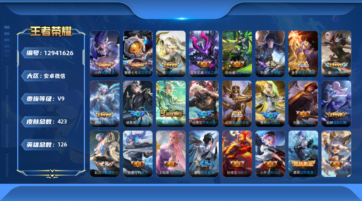[12941626]AK332 安卓WX差66369到v10!-V9-至尊星耀I段位-126英雄-423皮肤-3典藏-0珍品无双-0无双-0珍品传说-25传说-135史诗